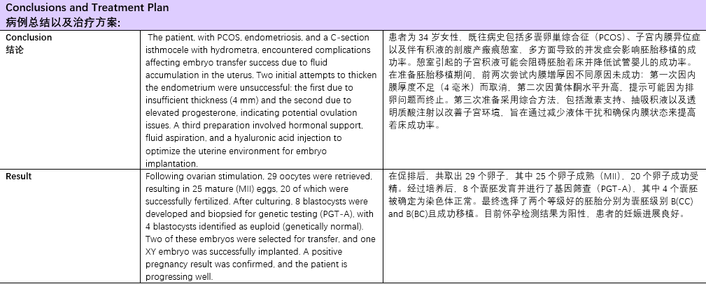 第三次准备内膜,月经第17天,我怀着忐忑的心情去做检查,激素检查结果是雌二醇182.2pg/ml,孕酮<0.05ng/ml,阴超显示子宫憩室伴有积水。医生看着检查结果,跟我详细解释了情况,然后给了我两个选择。一个是做宫腔镜处理积水,然后休息2个月再准备内膜;另一个是移植前进行抽吸和透明质酸治疗。我和老公回家后,仔仔细细地商量了很久,最后决定选择后者。之后我就严格按照医生开的药吃,有补佳乐、阿司匹林、泼尼松龙、地屈孕酮、子弹头塞药、雌二醇凝胶、万托林、阿莫西林,每天看着这些药,心里既无奈又充满期待。月经第19天,激素检查雌二醇190.4pg/ml,孕酮0.17ng/ml,内膜厚度12.2毫米,看到内膜厚度长起来了,我心里稍微有了点安慰。月经第21天,雌二醇188.1pg/ml,孕酮0.13ng/ml。月经第23天,医生帮我抽吸了子宫憩室内的积水,还往子宫腔内注射了3ml透明质酸。整个过程我都特别紧张,但又觉得这是离宝宝更近一步的希望,所以一直给自己打气。