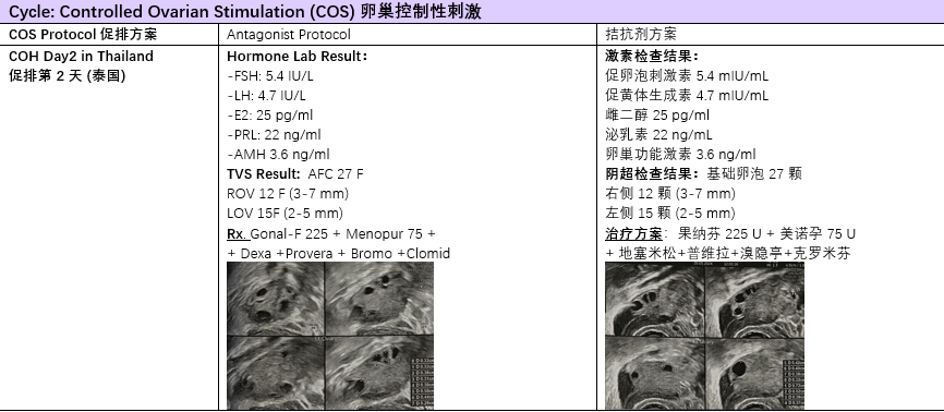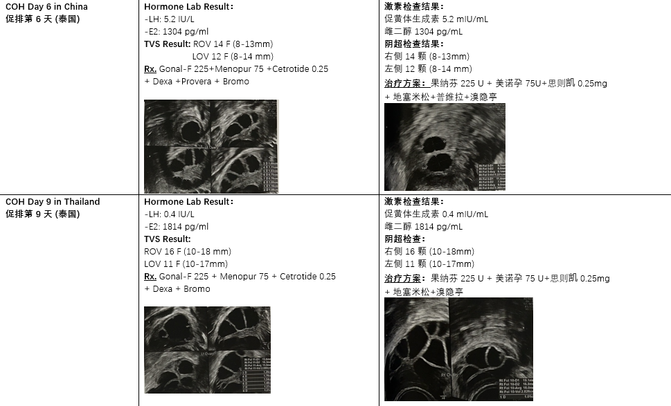 接着就到了促排阶段,我采用的是拮抗剂方案。促排第2天,我去医院做了一系列检查,激素检查各项数值我都记得清清楚楚,促卵泡刺激素5.4mIU/mL,促黄体生成素4.7mIU/mL,雌二醇25pg/ml,泌乳素22ng/mL,卵巢功能激素3.6ng/ml,阴超检查显示基础卵泡有27颗,右侧12颗(3-7mm),左侧15颗(2-5mm)。医生根据我的情况,给我制定了治疗方案,用果纳芬225U+美诺孕75U+地塞米松+普维拉+溴隐亭+克罗米芬。促排第6天,我又去医院复查,促黄体生成素变成了5.2mIU/mL,雌二醇飙升到1304pg/mL,阴超看到右侧卵泡14颗(8-13mm),左侧12颗(8-14mm),医生根据卵泡的发育情况,调整了治疗方案,改为果纳芬225U+美诺孕75U+思则凯0.25mg+地塞米松+普维拉+溴隐亭。