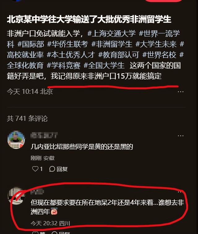 而且听说对这类孩子的父母还有硬性要求,好像是必须要在当地待两年还是四年来着。想想这些学生要跟着父母去非洲待上四年,回来再考北大或者上交,这到底值不值呢?