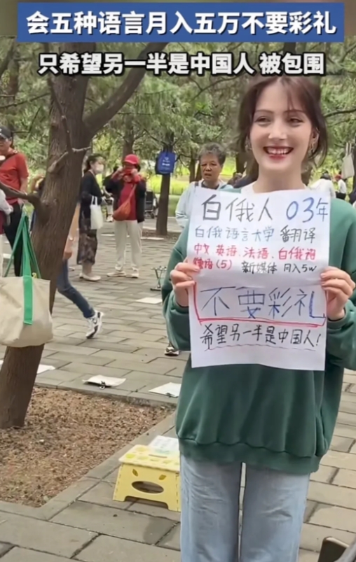 这是要卷我国婚姻市场吗 9月11日,北京一相亲角,一个漂亮肤白身材好的,白俄罗斯人在北京市某相亲角相亲,可见长相甜美,皮肤白,,自己学历,白俄罗斯大学,翻译,会五个国家语言,中文,英语,法语。德语,白俄罗斯语言,21岁,新媒体工作,月入五万,要求不要彩礼,希望另一半是中国人,我滴妈呀,看的我都心动流口水了,这长相条件,小编根本配不上人家,,21岁这自身条件收入,已经超过了百分之九十九的人,不过要是我们中国女孩子这条件和相貌个收入,,大家觉得会要求我们男的有什么?欢迎大家讨论聊聊