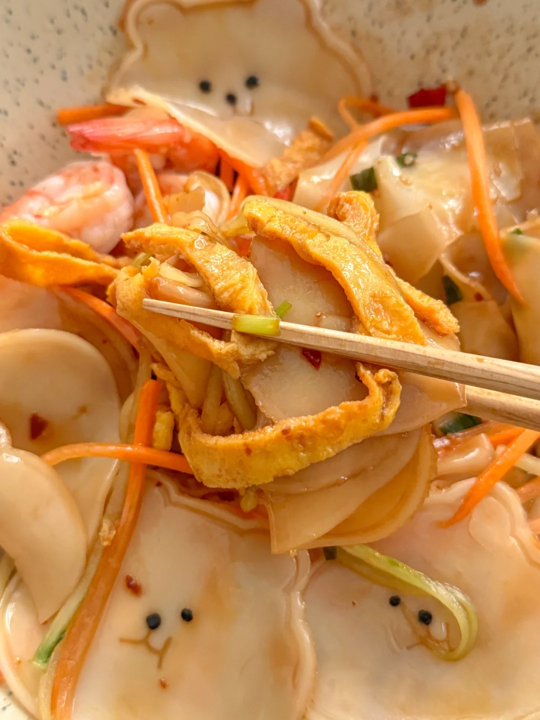 3️⃣水开后先把剩下的饺子皮拉成条下锅煮熟后捞起,再一片片下小熊面片,煮熟后捞起