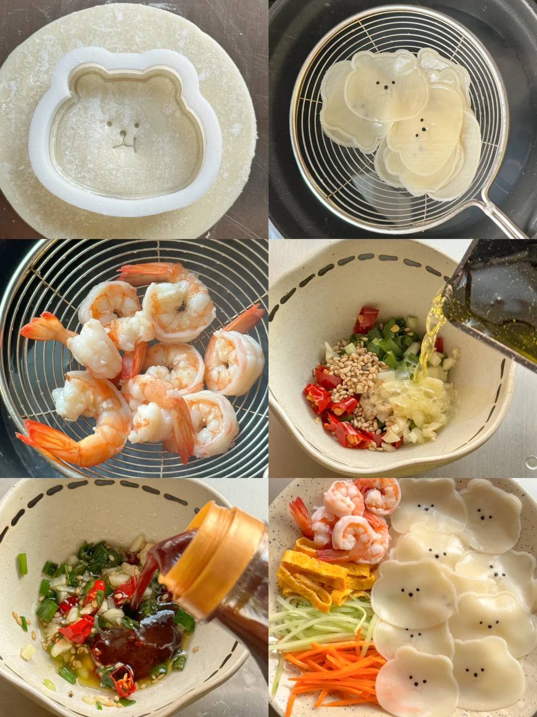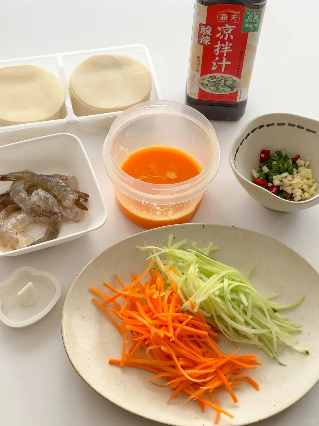 1️⃣胡萝卜和青瓜擦成丝,虾仁去壳去虾线后焯熟,鸡蛋打散加盐和清水,摊成蛋饼后卷起来切成丝