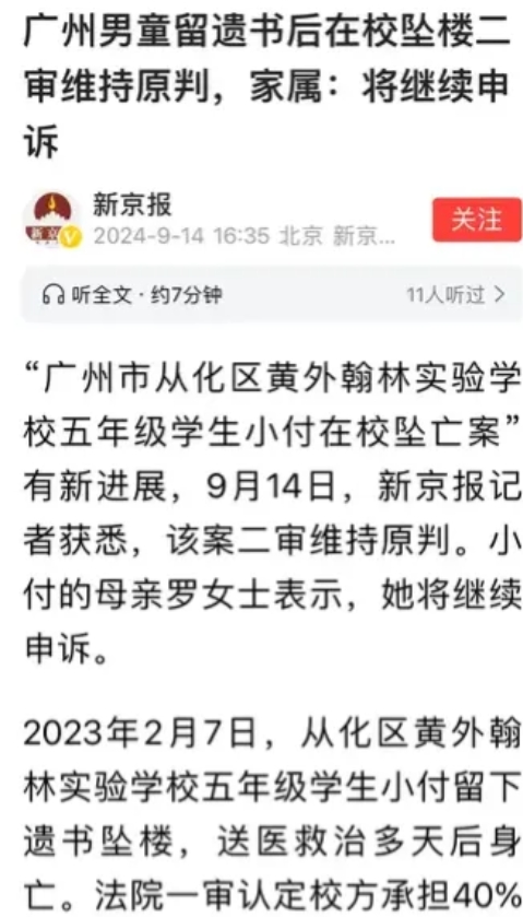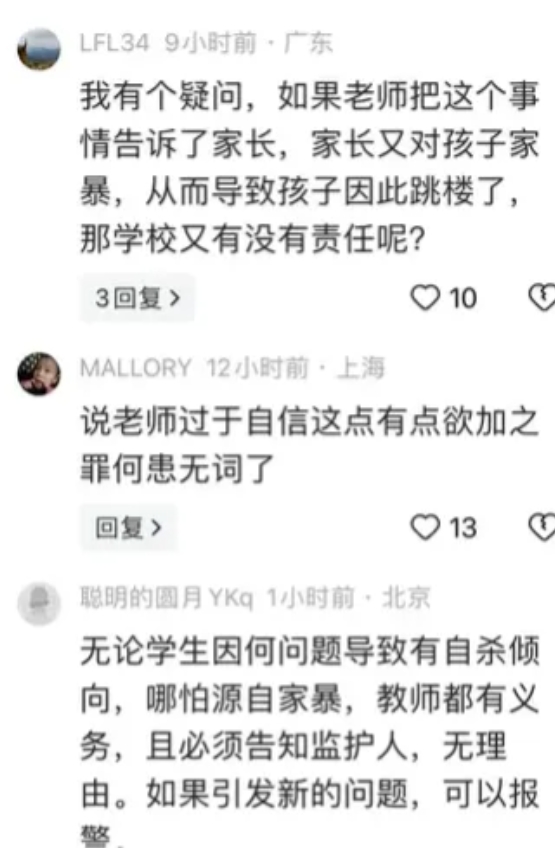 一起令人痛心的学生跳楼事件,深刻触动了社会的神经。在一所寄宿学校的静谧之中,一名五年级学生不幸选择了极端的方式结束了自己的生命。事件的焦点在于,班主任事先得知了学生的自杀倾向,尽管进行了深入的沟通与情感慰藉,却因尊重学生的意愿,未立即通知家长,这一决定随后引发了广泛的争议。 学生以纸条的形式向班主任敞开了心扉,这不仅是对老师的一种信任,也透露出他内心深处的挣扎与绝望。他甚至分享了与家庭冲突的私密日记,进一步揭示了走向极端的原因。班主任以高度的责任心,进行了细致的交流,成功安抚了学生的情绪。然而,在学生的恳求下,她选择保守秘密,未将此事告知家长,这一出于保护学生心理状态的举动,却不幸未能阻止悲剧的发生。 回溯整个事件,班主任的初衷无疑是出于对学生的爱护与尊重,但遗憾的是,她未能准确预判事态的严重性,导致了误判。从职业道德上看,她并非失职或冷漠,而是试图在维护学生信任与避免家庭冲突之间寻找平衡,却未能把握住那个微妙的临界点。 法律的天平最终裁定学校承担部分责任,但这背后,学校与老师同样承受着难以言说的委屈。他们深知,家庭矛盾才是学生走向极端的根源,却也无力完全避免悲剧的发生。家长的情绪反应亦可理解,他们质疑学校为何未能在第一时间介入,要求更严格的监管与责任追究。 然而,站在更广阔的视角审视,我们不得不面对一个残酷的现实:即便学校与老师采取了更为直接果断的措施,如立即通知家长并将学生带回家中,也无法完全保证悲剧不会以另一种形式发生。家庭的温暖与支持,在防止青少年心理危机中扮演着不可或缺的角色。