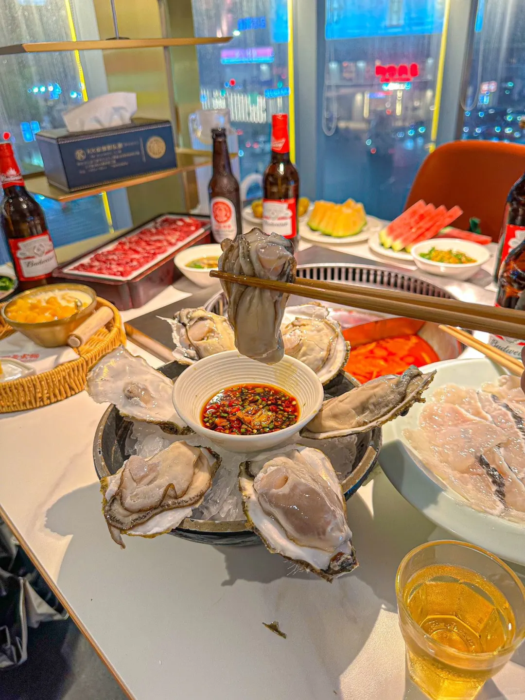 生蚝现开现翘,个头跟成人手掌一样大🖐️ 新上的甜品也hin不错,芒果星人i惨了 更推荐晚上来吃,能看到整个市中心的夜景