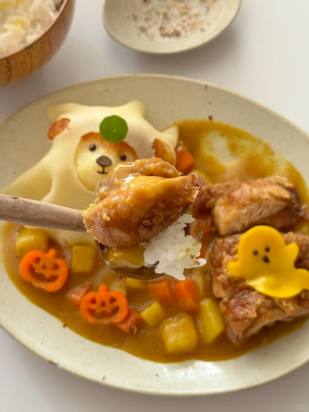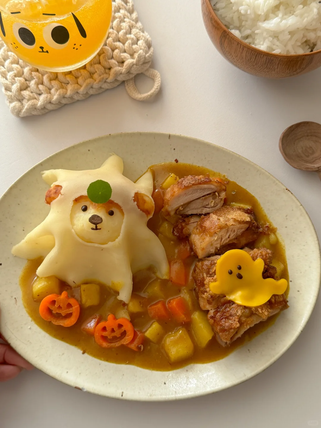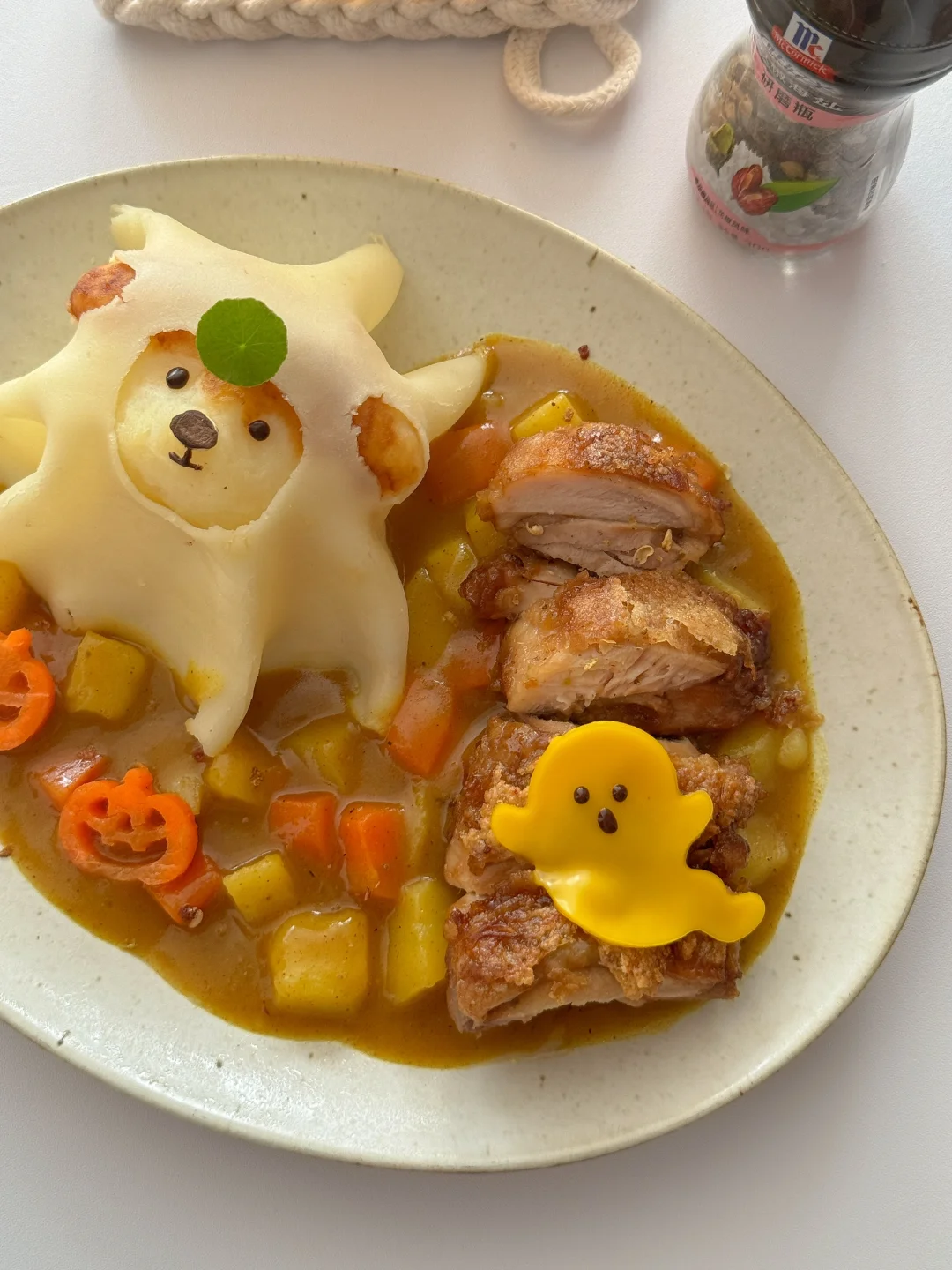 7️⃣做好幽灵小狗后,浇上咖喱酱和切块的鸡腿肉,最后表面撒上双椒海盐就可以啦