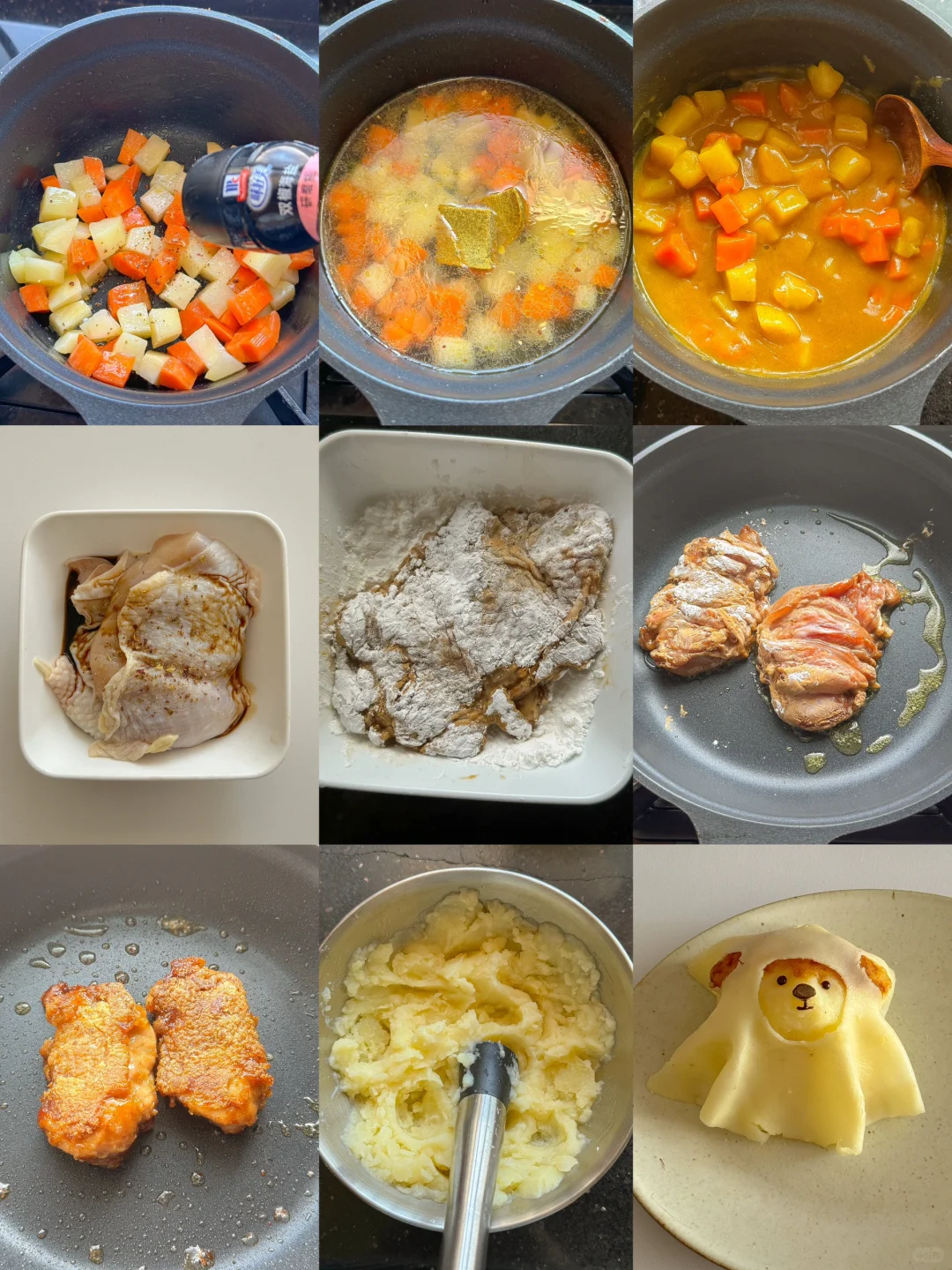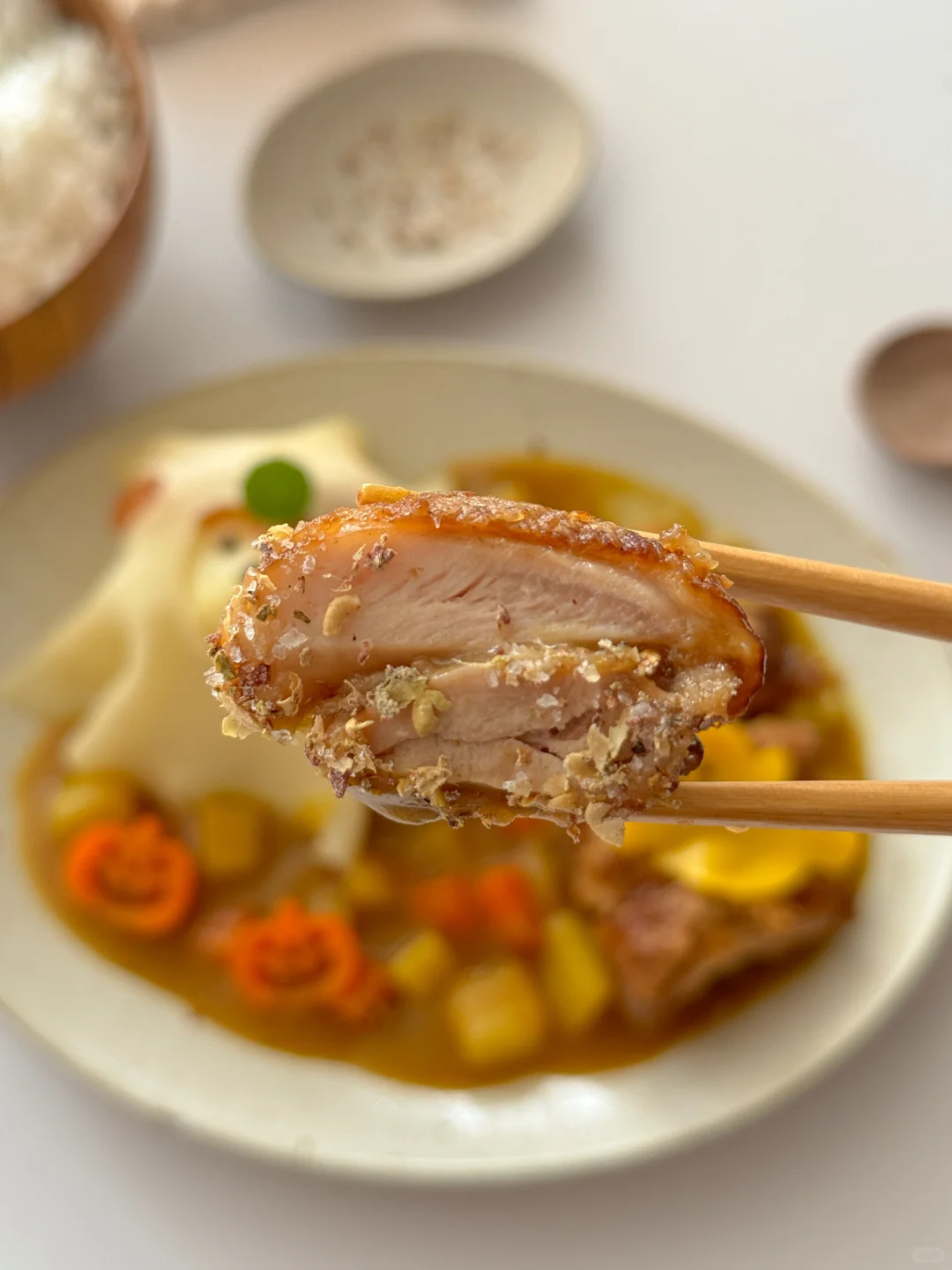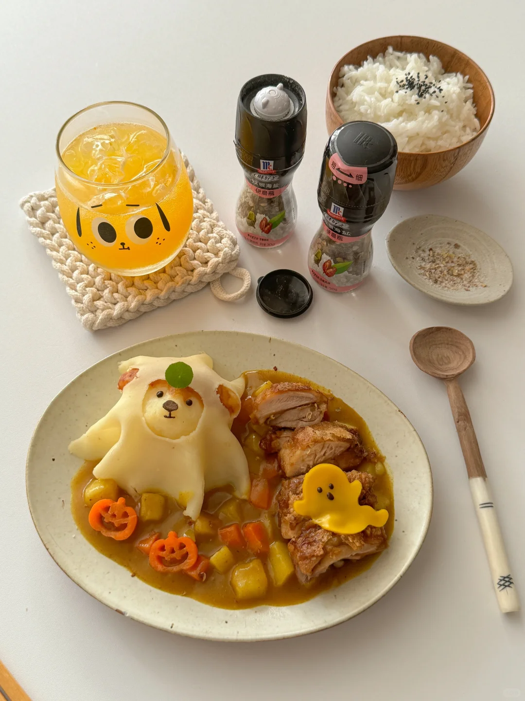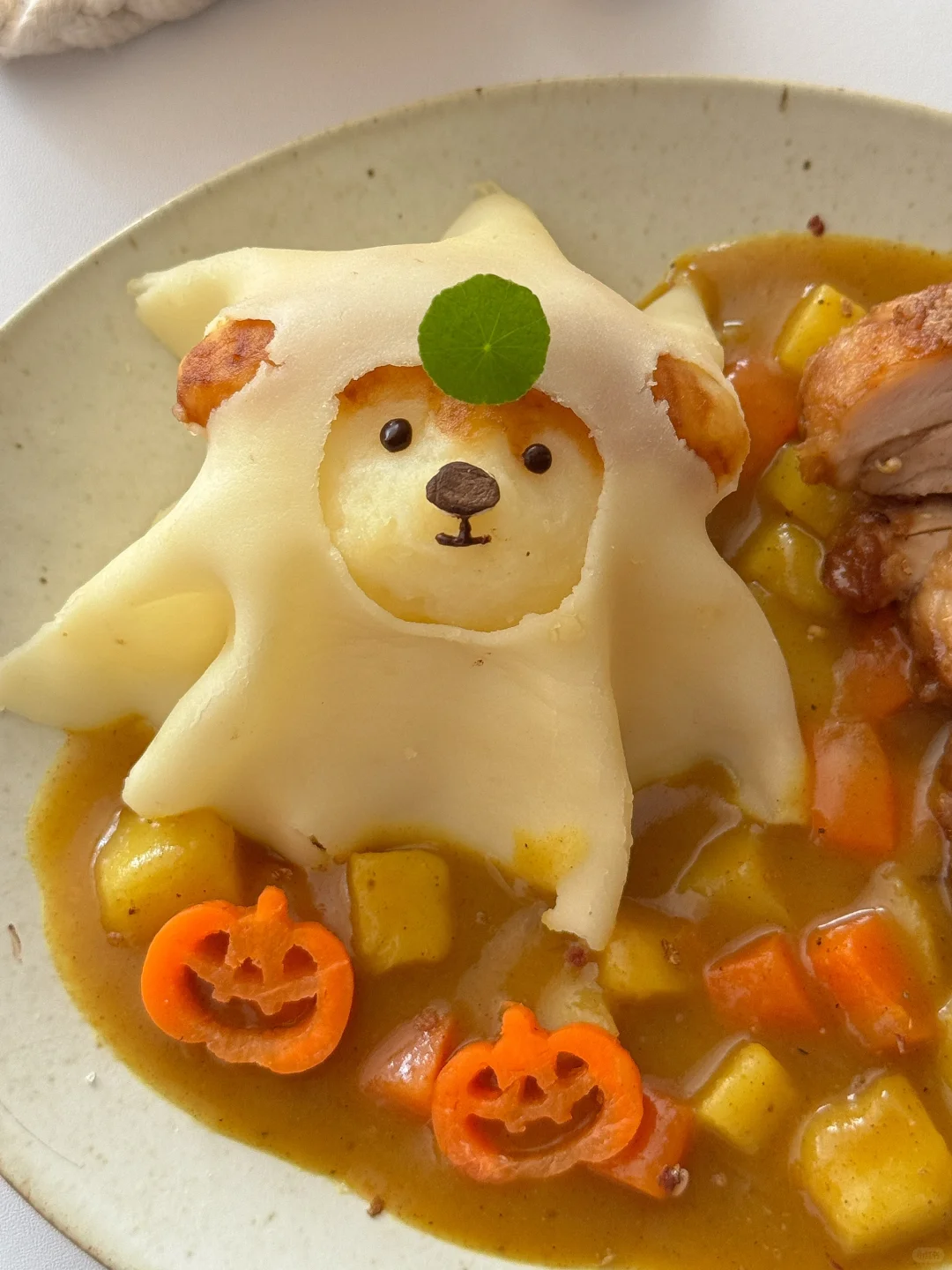 7️⃣做好幽灵小狗后,浇上咖喱酱和切块的鸡腿肉,最后表面撒上双椒海盐就可以啦