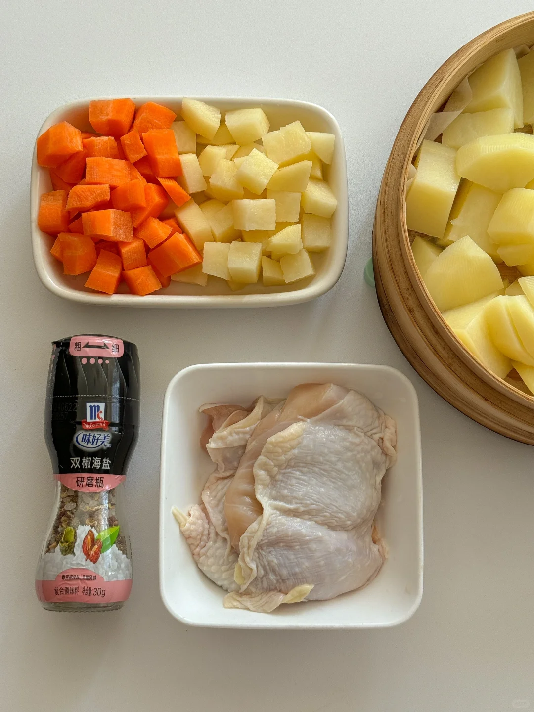 鸡腿肉、土豆2个、胡萝卜、咖喱块、味好美双椒海盐调味料、玉米淀粉
