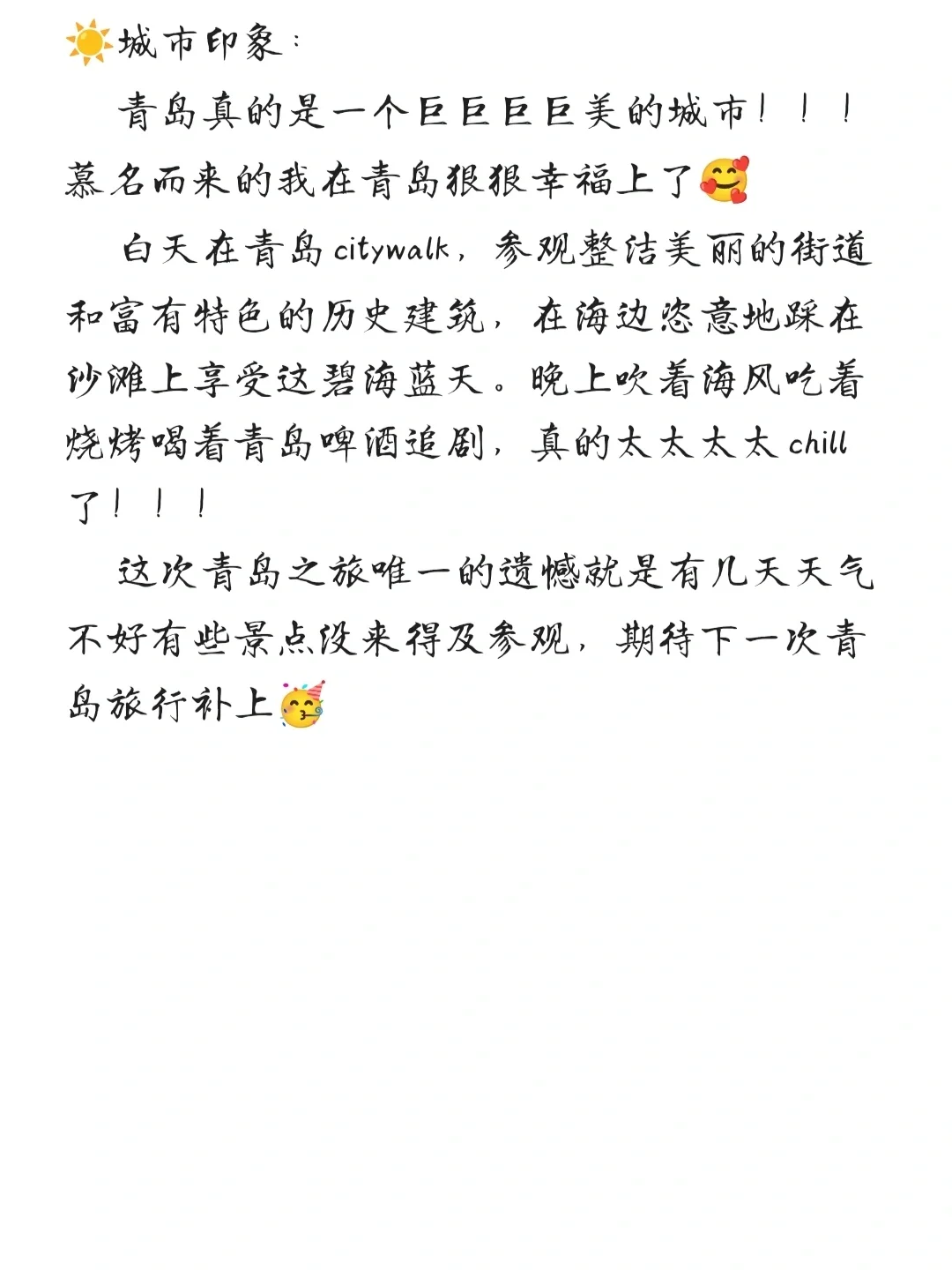 ☀️暑假来到了青岛,感叹青岛真的是一个巨漂亮的城市!整洁美丽的街道,蔚蓝无边的大海,无需滤镜随手一拍都是大片!晚上吹着海风吃着烧烤喝着青岛啤酒追剧,真的太惬意啦[喝奶茶R]