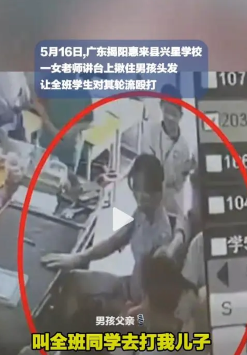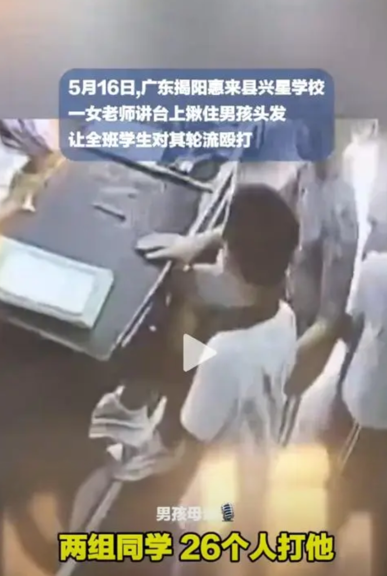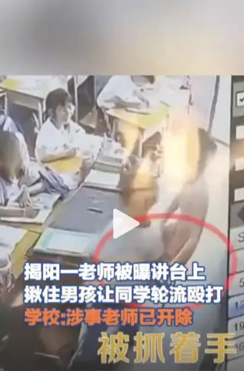 “这样的老师,太可怕了!”广东揭阳,一女老师让一男生走到讲台后,突然拽住男孩,然后指使班级里26名学生上前,让学生轮流殴打男孩。事发后,学校工作人员回复,“涉事老师已经开除了,被打小孩没事!” 但这句话根本平息不了网友的怒火,因为这和校园霸凌还是有所差距的,校园霸凌是学生之间的事情,可这件事是老师教唆学生们去霸凌,这对于一个学生来说,甚至会成为一辈子都无法忘却的阴影! 那么事情的当天究竟发生了什么?学生的身体状况又是如何呢? (本文信源来自于:上游新闻2024-5-19《广东揭阳,学校回应女老师讲台上揪住男孩头发让全班同学轮流对其殴打:涉事老师已开除》) 春蝉到死丝方尽,蜡炬成灰泪始干。对于教师这个职业,无一例外,大众都会觉得这是神圣的。他们用毕生所学,去教导每个孩子健康成长。 要说学子是一个国家的基础,那么教师就是基础的奠基人。但大家没想到的是,作为一名教师,她居然会去教唆全班学生去殴打一个学生。 那天傍晚,父母突然发现孩子的双眼通红,身上也有些淤青,面对父母的询问,孩子表示肚子疼、头疼。 为了清楚自家孩子是怎么受欺负的,他们找到了学校调出了教室内的监控摄像,令在场所有人都没有想到的是,教室里竟然会出现如此不堪入目的一面。 只见学生正坐在座位上,突然就被女老师给叫上了讲台。随后,老师便叫其他同学上台,轮流殴打这个学生,而学生想跑也跑不了。因为他被女老师死死的拽住,一点挣脱的希望都没有。 而上台后的学生,有的奋力殴打,有的不忍动手,但碍于老师的指令,只能轻轻的拍一下学生,就赶忙回到了自己的座位上。 就这样,经过26个学生的殴打之后,这场闹剧才终于结束。 看到自己的孩子如此被欺负,家长肯定不会坐视不理,毕竟这是自己的亲生骨肉,自己都舍不得打一下,怎么能容忍女老师这样欺负呢? 为了为孩子讨回公道,也为了保护其他无辜的学生不再受到同样的伤害,他们将这一严重的事件公布在社交网络上。他们希望借助社会的力量,唤起大众对校园暴力的关注和对教育工作者的责任认知,同时,他们也希望能为他们的孩子争取到公正的处理结果。 视频在网络上迅速发酵,引发了公众的极大关注。许多网民表达了对这位女老师的不齿,他们认为身为一名教育工作者,应该用耐心去引导和教育学生,而不是用暴力来解决问题。这种行为不仅有违教育原则,更是给学生树立了一个极坏的榜样。 对于这起事件,学校的回应也引发了公众的质疑。校方声称已将涉事女教师开除,并表示被打的学生已无恙。但这并没有平息大众的怒火,因为开除并不足以弥补对孩子造成的心灵伤害。 而这起事件再次引发了对当前教育问题的深刻反思,一方面,教育部门需要加强对教师的培训和监管,确保他们在道德素质和专业能力上都符合教师的行业标准。 另一方面,也需要对学校进行整改,以防止类似的悲剧再次发生。最重要的是,要从小培养学生的正面价值观和道德观念,使他们能够在社会中健康成长。 那么对于此事,大家又有什么看法呢?