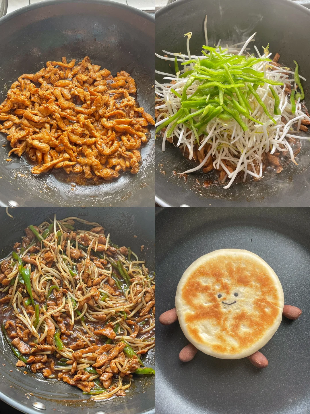3️⃣起锅烧油,油热后倒入鸡胸肉,等到鸡胸肉炒熟后加入青椒和豆芽,稍微翻炒一下就可以出锅啦