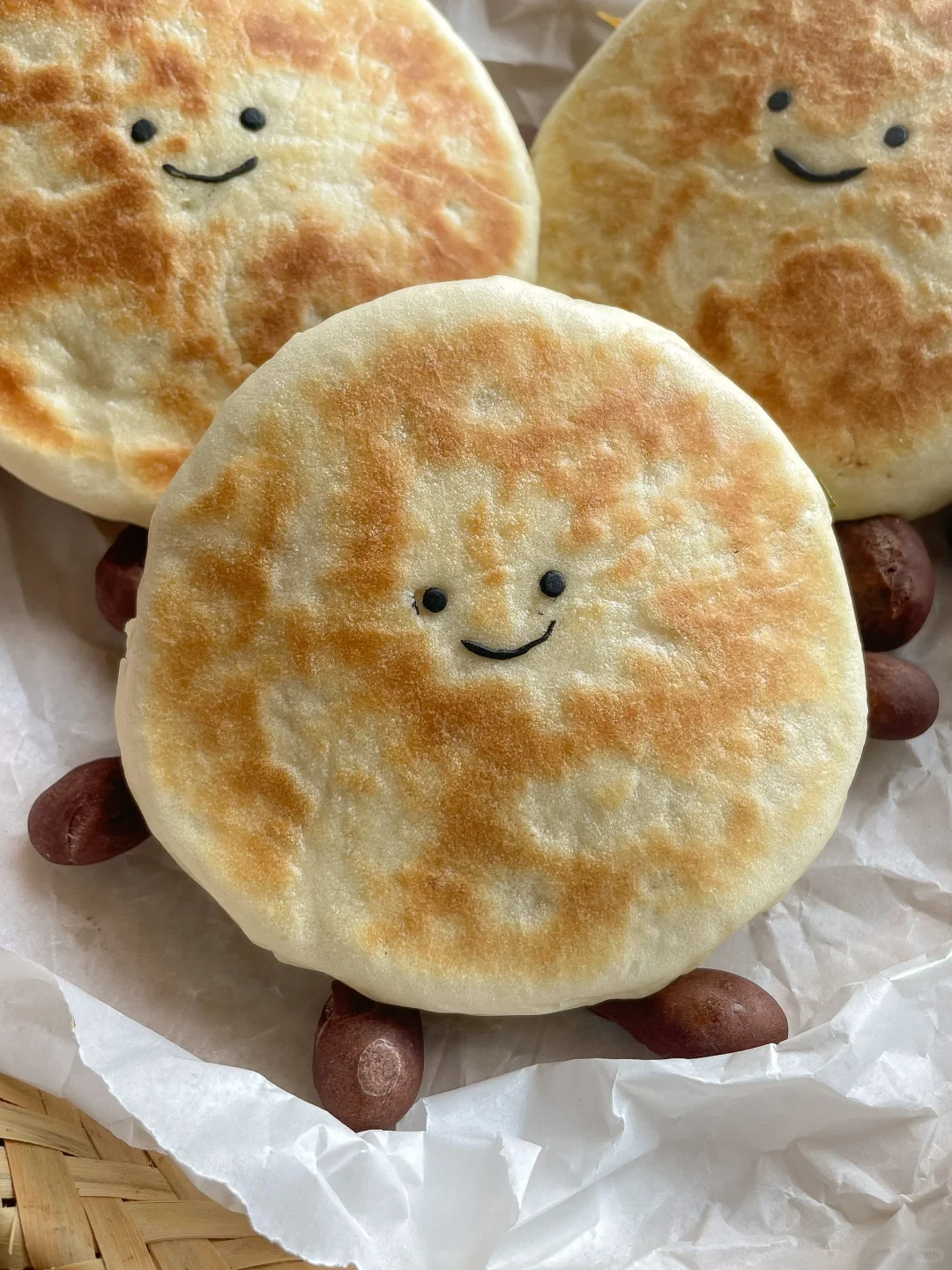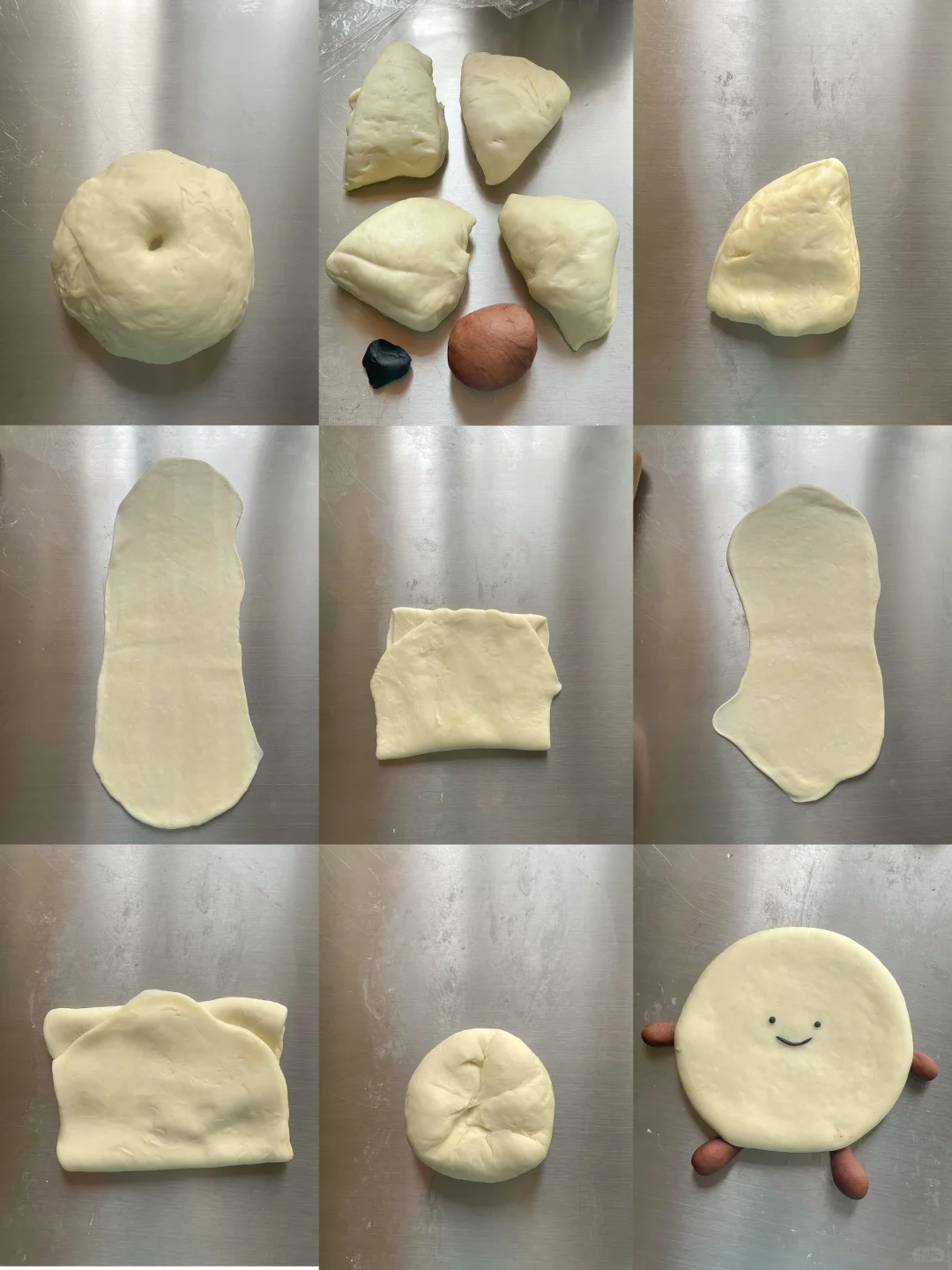 4️⃣光面朝下揉圆,用竹炭面团制作成表情粘上去,再用擀面杖擀成小圆饼