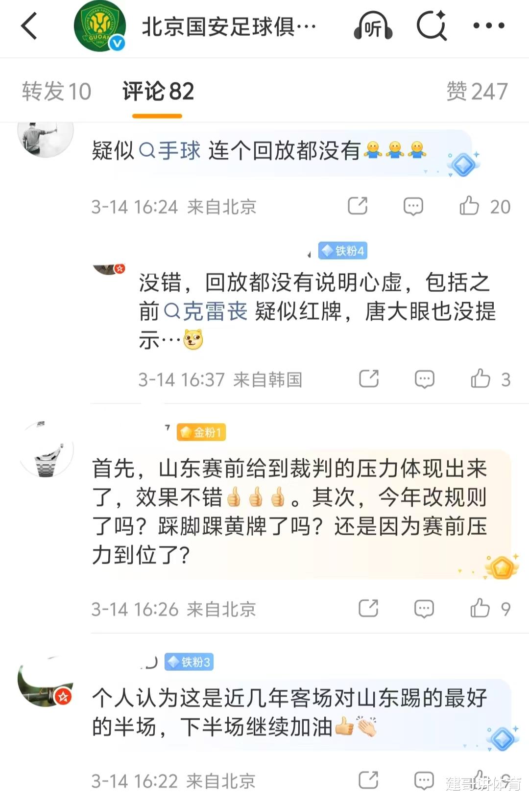 北京时间3月15日,北京国安VS山东泰山队的中超第二轮比赛,以北京国安客场1-2输球结束,对于这场比赛的输球,北京球迷好像有很多话要说,更对这场输球表示不服,尤其是在北京国安官方更新动态介绍这场比赛的情况时,更是点燃了这些不服输球的国安球迷的情绪,他们认为是裁判偏袒了山东泰山队,才让国安结束了超级杯和中超的2连胜。