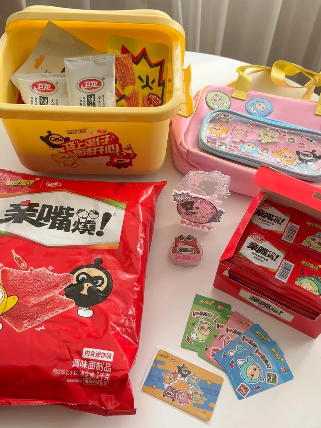 联名物料不仅有痛包,还有礼盒,里面有超多卫龙产品,轻松实现零食自由,联名周边也很丰富!而且礼盒还能当收纳箱用,性价比杠杠滴!