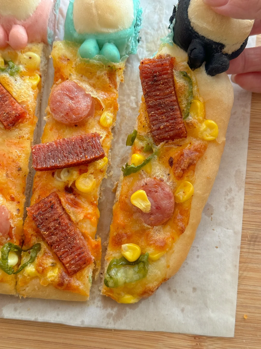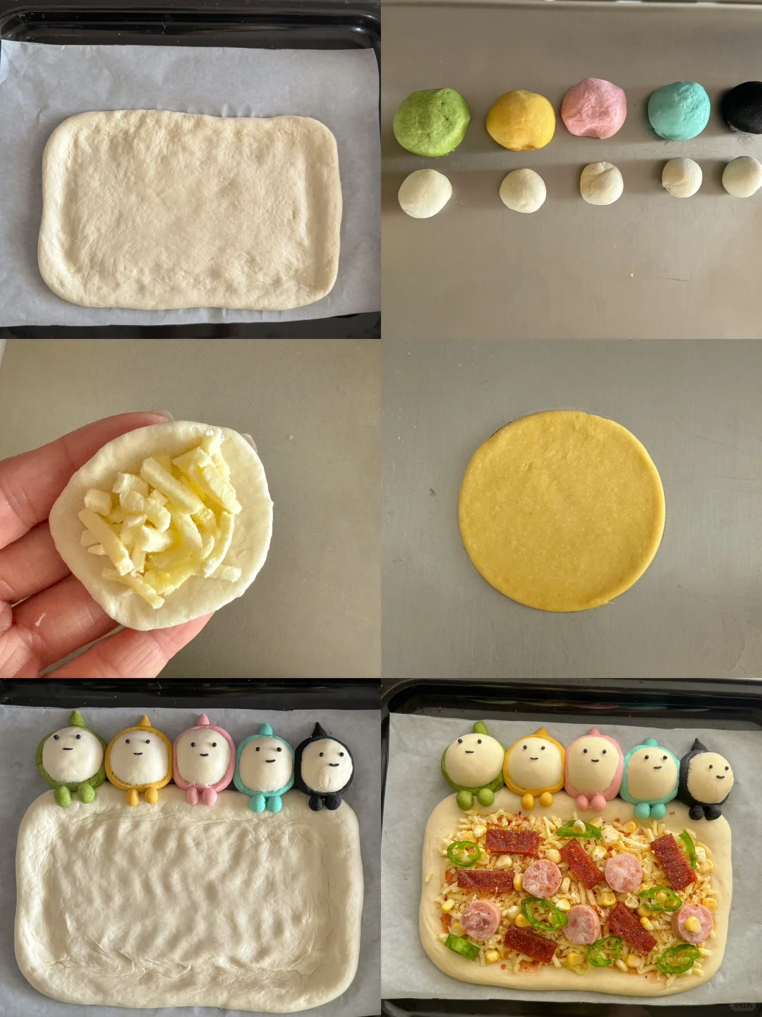 3️⃣发酵好的面团按压排气,分出50g作为蛋仔的头(每个头10g一个),里面每个包上芝士,剩余的面团制作成饼皮,造型好的披萨用叉子叉出洞后挤上番茄酱,铺上各种食材