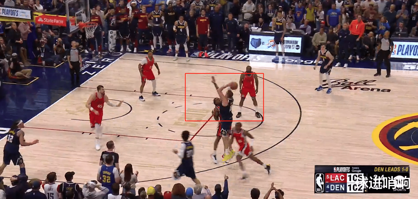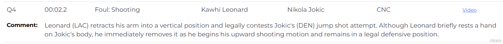 另外一次争议吹罚是最后2.2秒,掘金队落后3分,约基奇尝试出手绝平三分,但被小卡干扰没能命中,双方出现了一定的身体对抗。