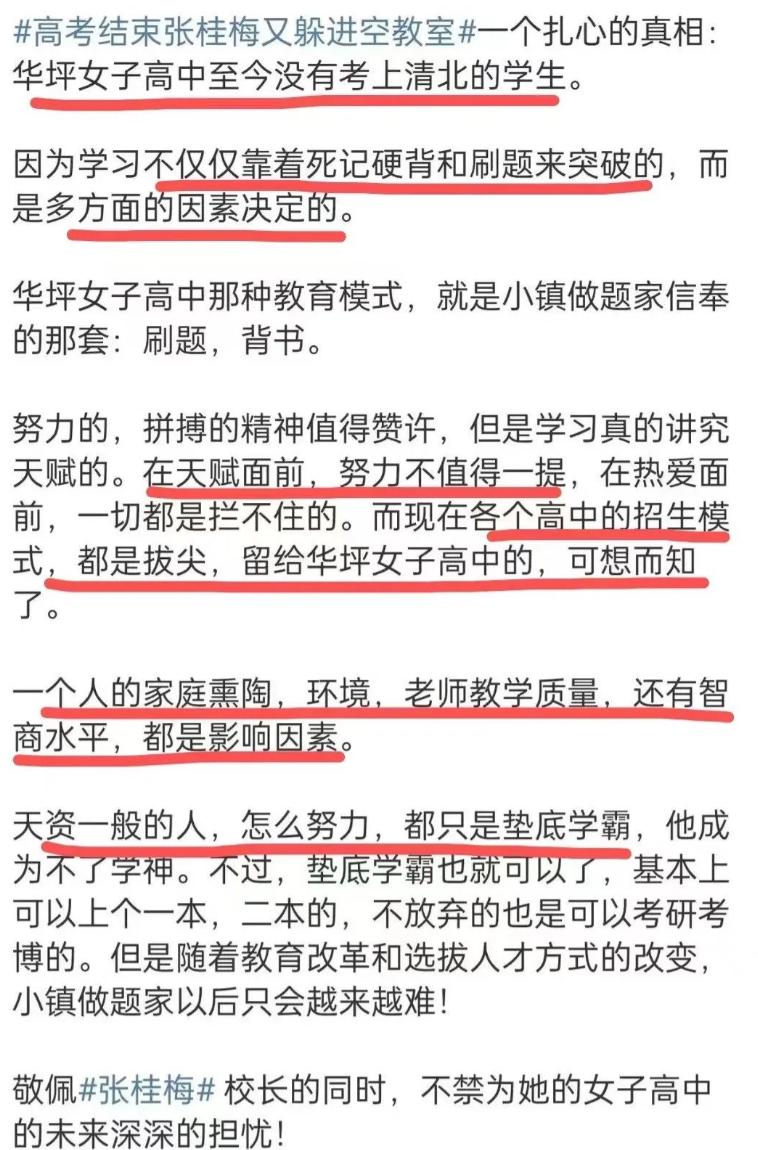 (信息来源:人民网-2024-09-10——《“校长妈妈”张桂梅:我把她们送出大山,她们把我留在人间》) 2023年高考结束后,张桂梅校长再一次成为舆论的焦点。 起因是一位百万粉丝的财经大V,在微博上发文,批判张桂梅校长只能培养“小镇做题家”,培养不出社会的精英人才,华坪女高至今无人考上清北就是证据。 面对质疑,张桂梅校长并没有过多辩解,她只是淡淡地说:“那是因为他们不了解这里的学生,不了解我们的教育环境。”言语间透露出一位教育工作者的睿智与坚定。 华坪女高地处云南丽江的偏远山区,这里的孩子大多来自贫困家庭,从小缺乏良好的教育资源,许多女孩到了十几岁,就被迫辍学打工或嫁人。 看着女孩儿们渴望知识,却又不得不离开课堂,张桂梅心痛不已。一个大胆的想法在她心中萌生,她想办一所女校,让更多女孩接受教育! 为了达成目标,她四处筹款,去敲政府的门、去找企业家,为了资助贫困女孩上学,她甚至不惜自掏腰包,卖掉了房子。 有了资金支持,她还要挨家挨户走访,苦口婆心地说服家长。经过不懈的努力,华坪女高终于在2008年正式创办,成为当地第一所免费女子高中。 学校建起来了,条件却十分简陋:教室里没有桌椅,学生们只能席地而坐;晚上一停电,大家就点着蜡烛继续学习;冬天寒风呼啸,同学们冻得瑟瑟发抖…… 条件艰苦,有的老师坚持不下去,选择了离开。但更多的老师却选择坚守在讲台上,拼尽自己所能,想尽一切办法来帮助学生。 学生的基础普遍较差,为了尽快提高成绩,学校不得不采取题海战术,让学生通过大量刷题、背书来掌握知识点。 尽管这种方法饱受诟病,但慢慢有了效果。经过老师同学的一致努力,华坪女高的教学质量逐年提高,本科上线率连续多年位居全县第一。 十多年来,学校已经输送2000多名学生考入大学,她们中有的成为了医生、警察、教师,用知识照亮了自己和家人的人生。 然而,受自身条件限制,华坪女高至今尚未培养出清华北大的学子。一些人便以此为由,对学校和张校长进行抨击。 殊不知,改变命运从来都不是一蹴而就的事。对于这些山里娃来说,能走出大山、接受高等教育,已然弥足珍贵。 “小镇做题家”这个词,本是那些埋头苦读的孩子们的自我调侃。可他们的努力,却在某些人眼中成了笑柄。他们站在制高点,轻蔑地俯视着那些只能靠刷题改变命运的平凡学子。 殊不知,正是无数“小镇做题家”的拼搏奋斗,才撑起了国家的脊梁,创造了时代的奇迹。试问,没有昔日的“题海战术”,哪来今朝的“创新人才”? 张桂梅曾说:“办教育就是要让每一个孩子都有出彩的机会。”在她眼中,孩子们并非考试机器,而是一个个鲜活的生命个体,他们理应得到最好的教育。 也许,华坪女高的学生无法在高考中斩获顶尖名次,但她们的视野被开阔,人生有了更多选择。那些质疑的声音,又怎能抹煞教育的意义? 教育的真谛,不在于培养出多少尖子生,而在于唤醒每个孩子心中的向往,让他们拥有追逐梦想的勇气。或许,这才是张桂梅和华坪女高给学生们的最宝贵财富。 一次高考,奠定人生走向;一位校长,点亮万千学子。这所大山深处的女子高中,用执着和坚守诠释了教育的真谛。无论前路多么艰辛,她们都将继续前行,用知识开创无限可能,用奋斗谱写时代华章。 让我们为张桂梅校长喝彩,为千千万万个“小镇做题家”喝彩。因为有了他们的执著坚守,祖国的未来必将更加光明璀璨!