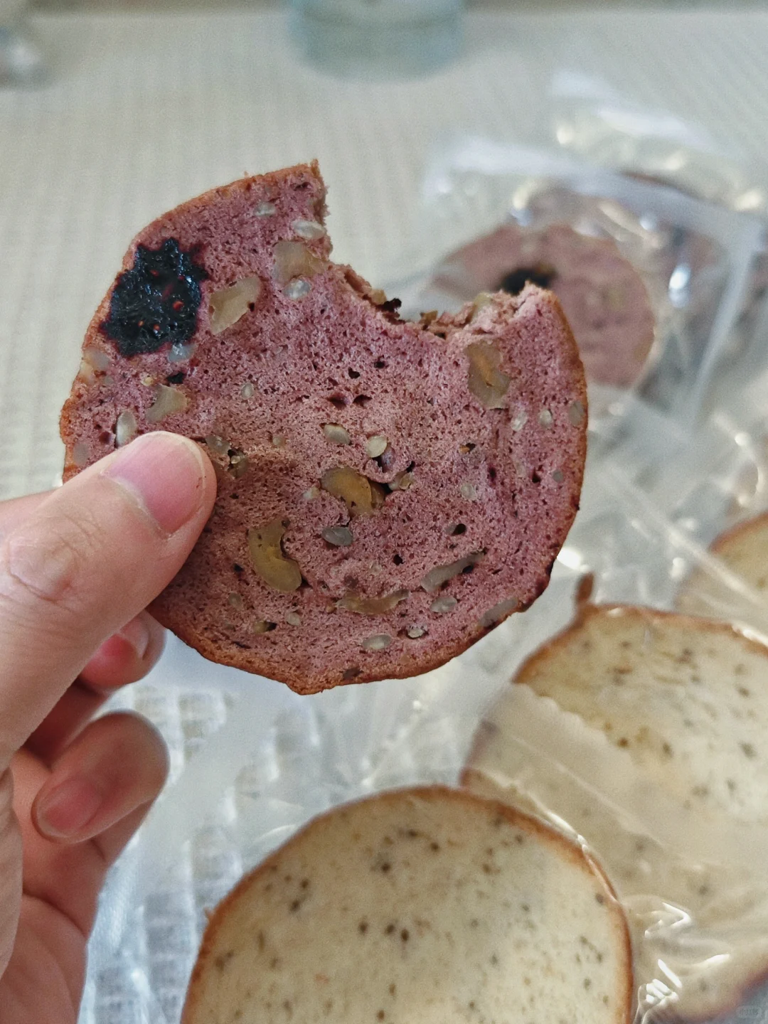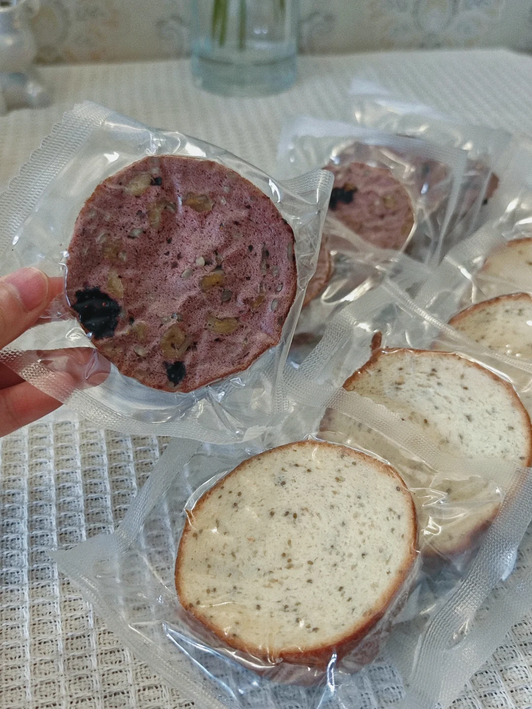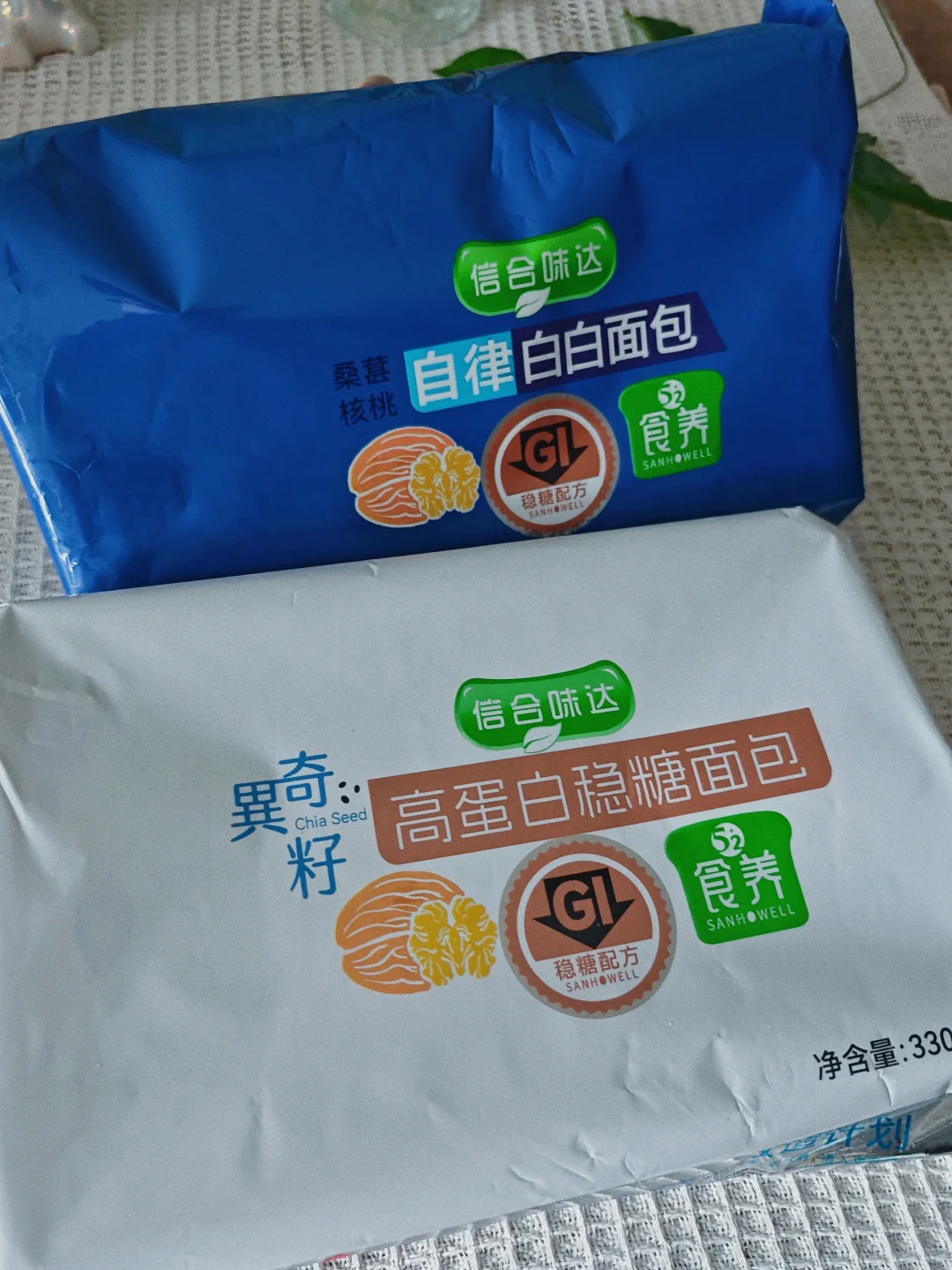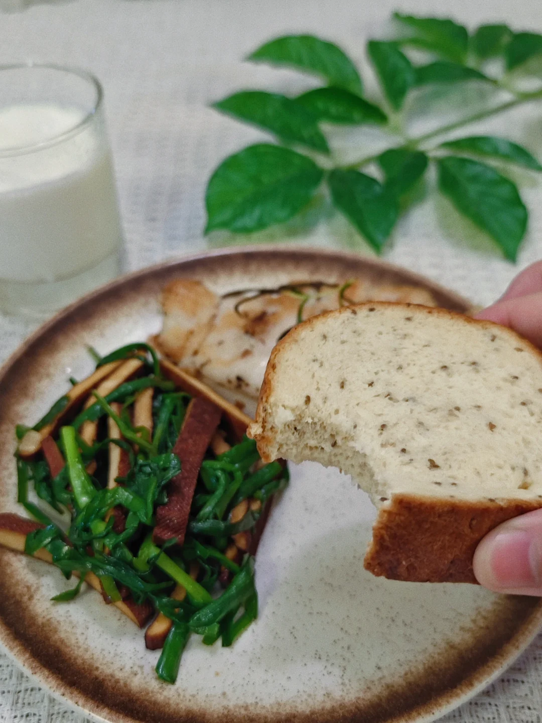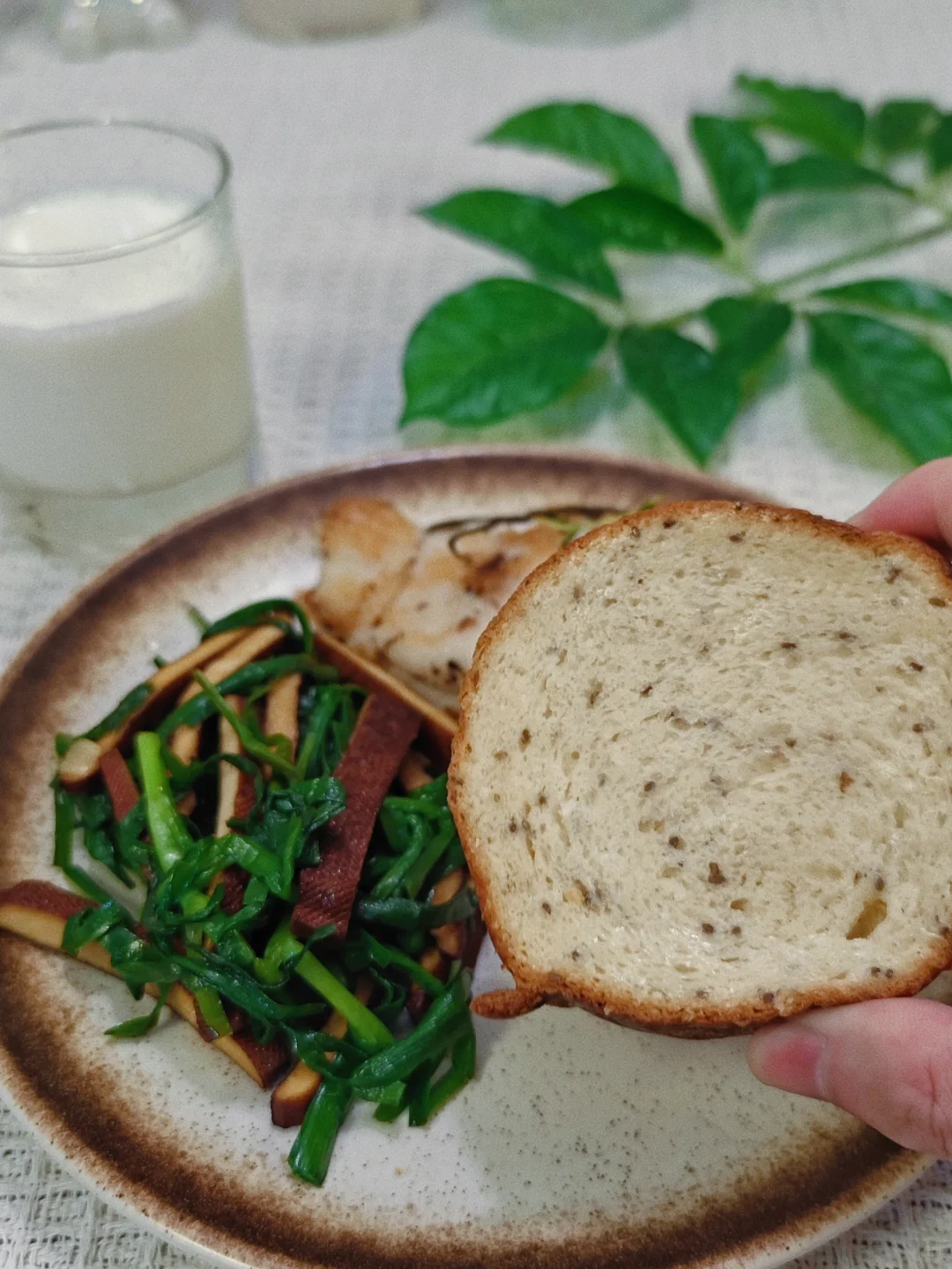平常天天在外面大鱼大肉,十一放假7天是应该吃点清淡的嘞! · 🌵今日菜谱 🍃韭菜炒香菜 🍃香煎鸡胸肉 🍃全麦低脂车轮面包 · ⚠️买的信合味达家的车轮面包,有两种口味,喜欢桑葚核桃味的,真的有大量的果肉,很有嚼劲!当然奇亚籽口味的也不错!