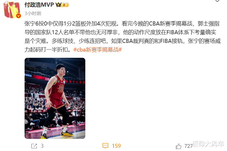 其次,这一场张宁自己打的不好,第二节过早身背3犯让自己处于被动;最后也是最关键的原因,40分钟赛制+FIBA尺度下,张宁被削弱了,不妨来看看媒体人付政浩的看法: