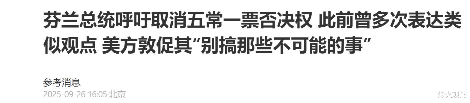 芬兰方面的相关言论,很有可能是出于这个国家一贯的“反俄”主张,在历史上,芬兰曾经长期是沙俄帝国的一部分,在一战后才获得独立,之后芬兰与苏联又打了震惊世界的苏芬战争。因此,芬兰自古就对苏/俄极为忌惮。而在俄乌冲突爆发后,芬兰又以迅雷不及掩耳之势闪电般加入了北约,这使得俄芬关系也进一步恶化。所以,芬兰一直对俄罗斯观感很差,这是芬兰总统要求取消五常一票否决权的重要原因。