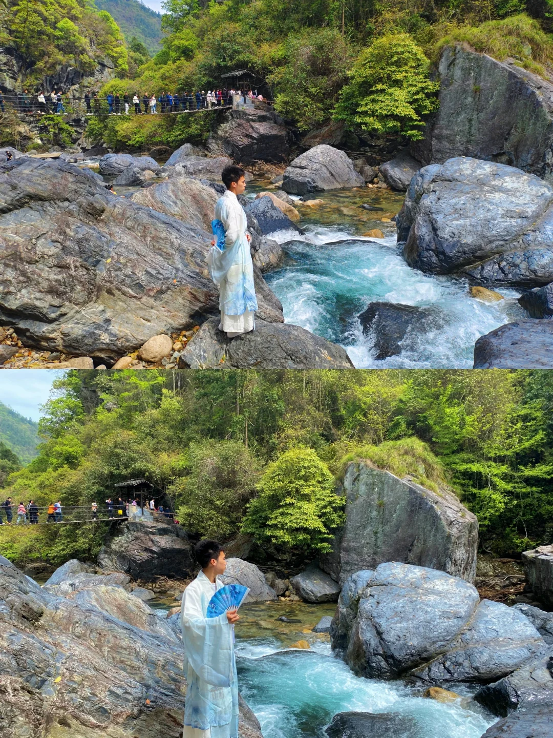 ③整个景区分西线(自然)和东线(人文),建议观光车下车后往左走(西线),前往龙门潭(看网红玻璃水,还有竹筏可拍照),再经过劝善桥,来到石谷奇观(山谷中蜿蜒的栈道,底下是一片翡翠般碧绿的潭水),再前往碧玉潭(也是一片很美的翠绿潭水),然后穿过竹海听涛,往上来到四叠瀑布(一条从天而降的瀑布,非常壮观),再向下来到鸳鸯潭,前往严家古村看徽派古建筑,然后到达景区出口,这样就能将两条线的景点串在一起。