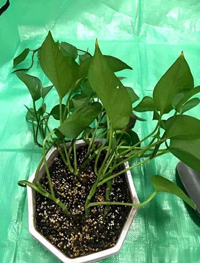 绿萝剪带气根的枝条丢水里,斜着切吸水快,一周冒白根。