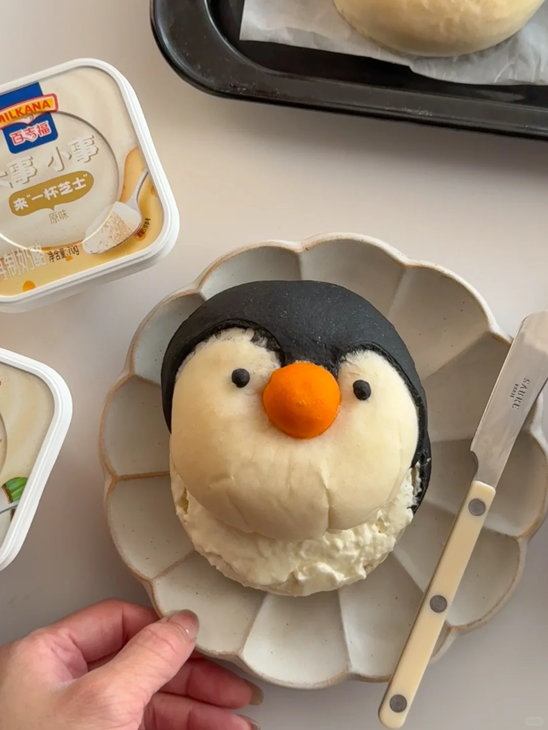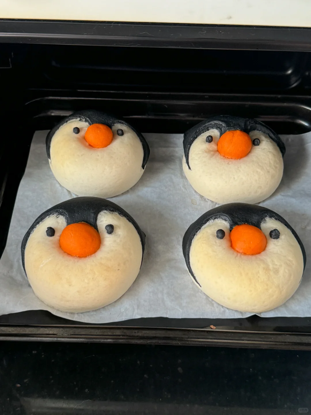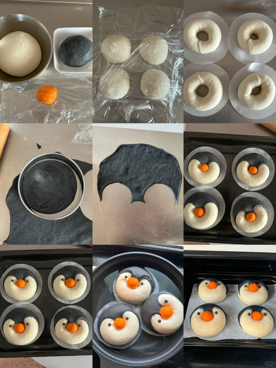 4️⃣黑色面团按压排气松弛,擀薄用模具按压出圆,再用小一点的圆压出企鹅脸部的形状,将他们都做好造型后放入烤箱发酵模式34度发酵20分钟