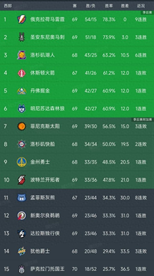 北京时间3月18日,今日的NBA常规赛结束了所有比赛,我们看看西部的战况和最新积分榜变动!