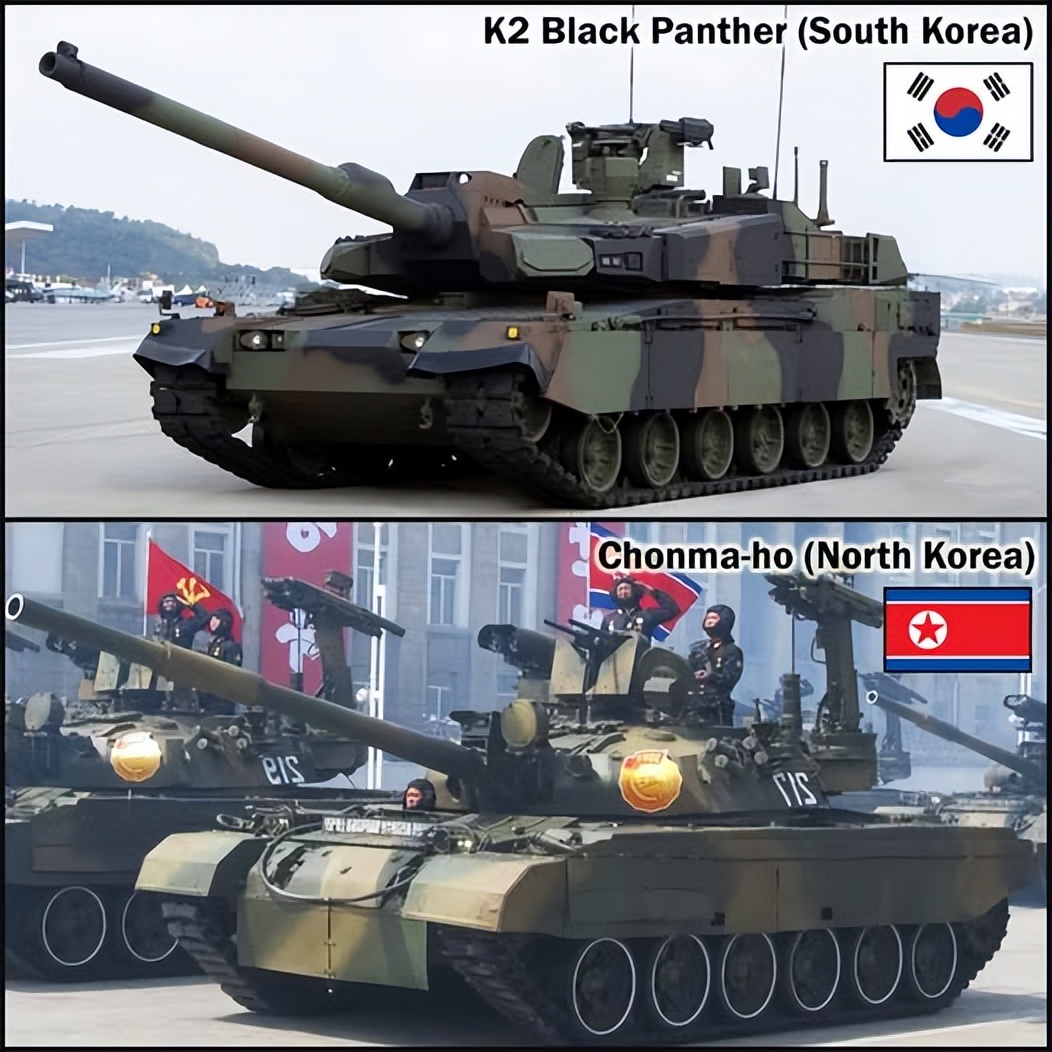 坦克方面,朝鲜军目前主力坦克是“天马-2”坦克,而韩国则是K2“黑豹”坦克,在火炮口径上,“天马-2”为125毫米,略高于“黑豹”的120毫米,另都安装有主炮同轴机枪。