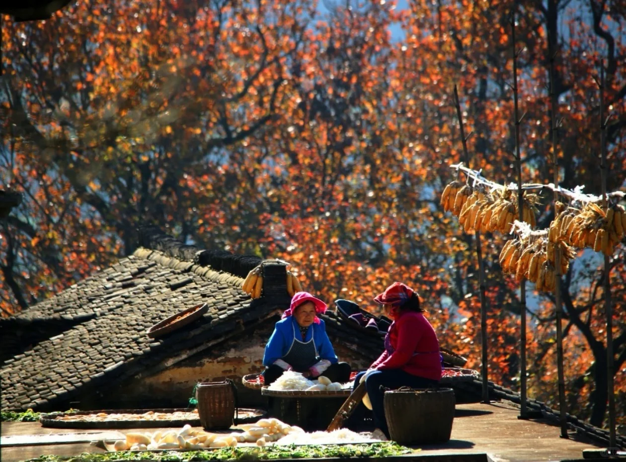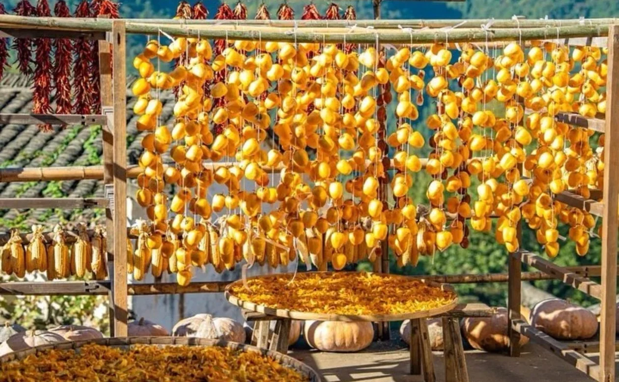 徽派民居白墙黑瓦之间,立上了“低调”人设,有人说南方的秋天就如同江南女子般,柔情似水,温文尔雅,低调深沉。可看似低调背后,确是万人瞩目的“中国最美乡村”! 石板巷间、白墙黛瓦掩不住层层叠叠的屋顶和晒架上五颜六色的作物,这就是“晒秋”,篁岭的一道亮丽风景线,也是这里最瞩目的符号。篁岭一晒,便已知秋。这里的美并不低调“山明水净夜来霜 数树深红出浅黄”夕阳渐下赤椒、红枫、黄菊、金稻与白墙黑瓦交织共绘出这并不低调的“最美乡村”“天上古村”。