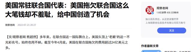 信息来源:观察者网 2022-7-21 美国常驻联合国代表:美国拖欠联合国这么大笔钱却不羞耻,给中国创造了机会