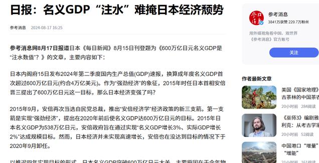 信息来源:参考消息 2024-8-17 日报:名义GDP“注水”难掩日本经济颓势