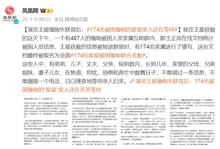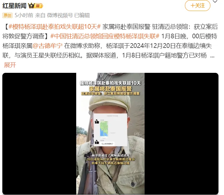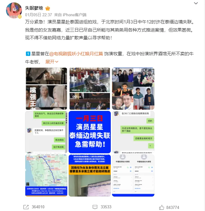 自1月5日王星女友微博发声,称男友赴泰国剧组拍戏,3日中午在泰缅边境失联。