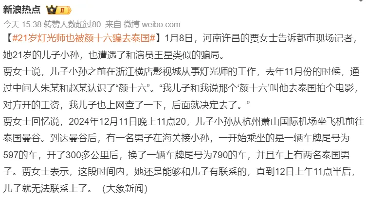 去年12月,横店一名21岁的灯光师,也被同一个演员统筹骗去泰国。