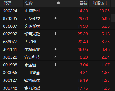 稀土永磁板块异动拉升 正海磁材午后20CM涨停