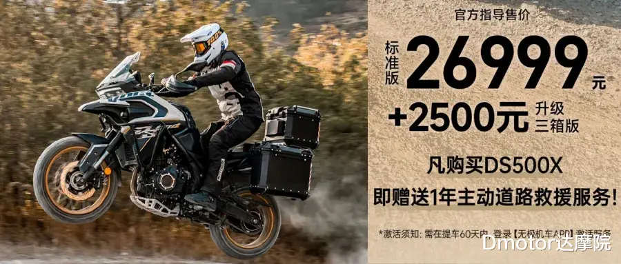 1月23日,无极机车正式发布全新DS500X,标准版售价26,999 元,三箱版在此基础上加2,500元,也就是三箱版最终价格29,499元。