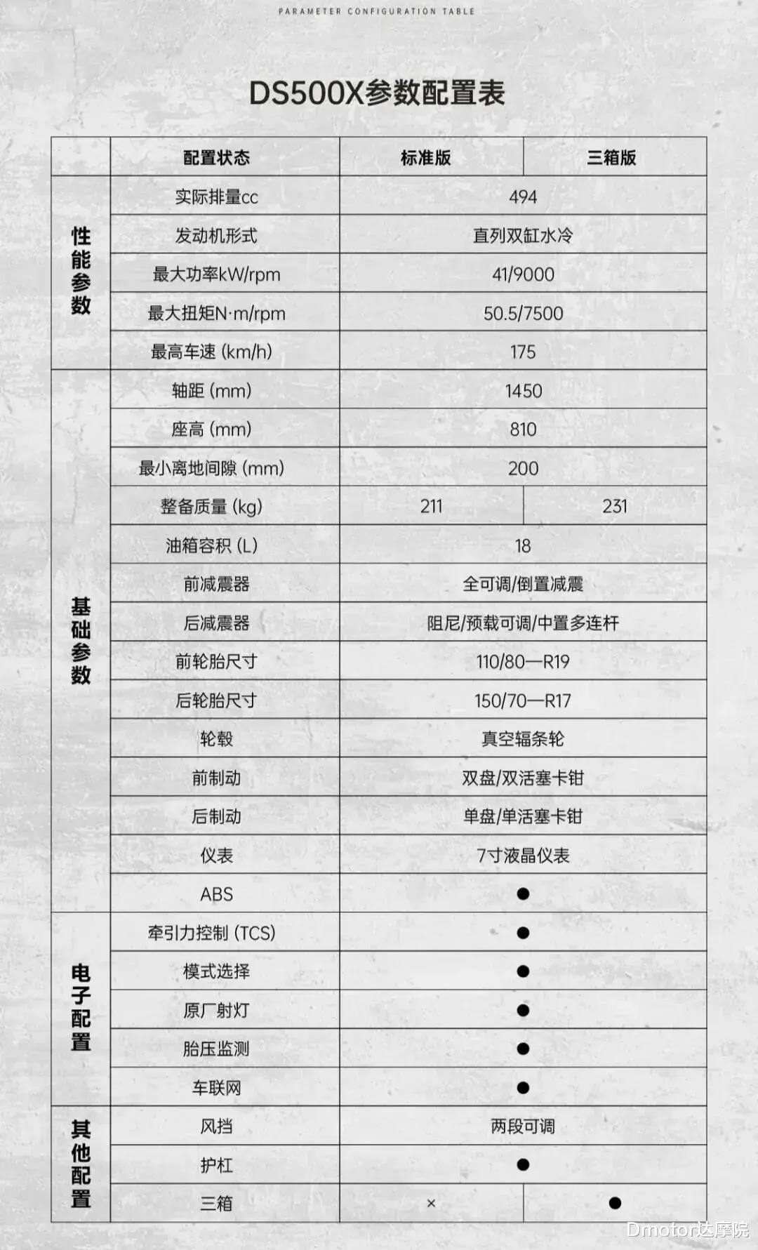 DS500X 的轴距为1495mm,座高810mm,最小离地间隙200 mm,整备质量方面,标准版211kg,三箱版231kg,拥有一定的稳定性与承载能力。