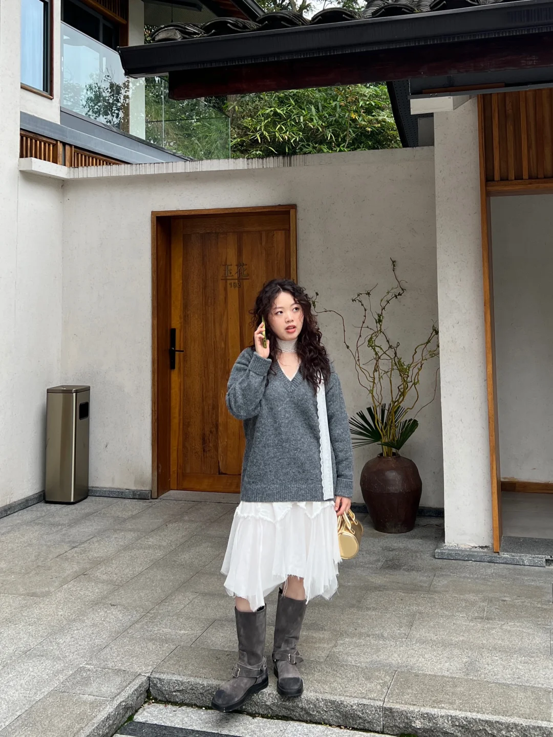 小个子穿搭 微胖女孩穿搭 灰色毛衣