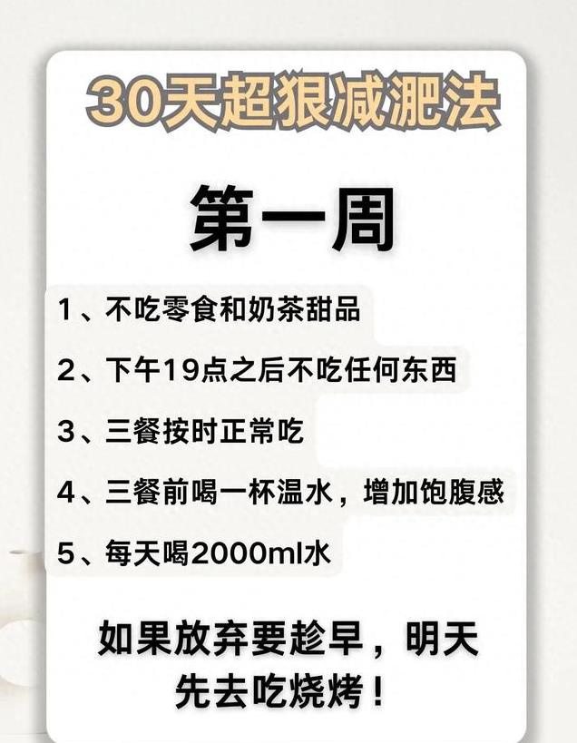 第一周,是适应期。每餐准时进食,让身体养成规律的生物钟。水是减肥的秘密武器,每天 1500ml 以上的饮水量,就像给身体做一场内部清洁。饭前喝一杯水,胃部提前被填充,进食时自然就会减少食量。记得哦,晚上 7 点之后坚决不再进食,给肠胃足够的休息时间。这一周无需运动,只要安心地遵循饮食规则,就能为后续的减肥之旅打下坚实基础,预计可减重 3 - 5 斤。当你成功坚持完这一周,就已经向胜利迈出了一小步。