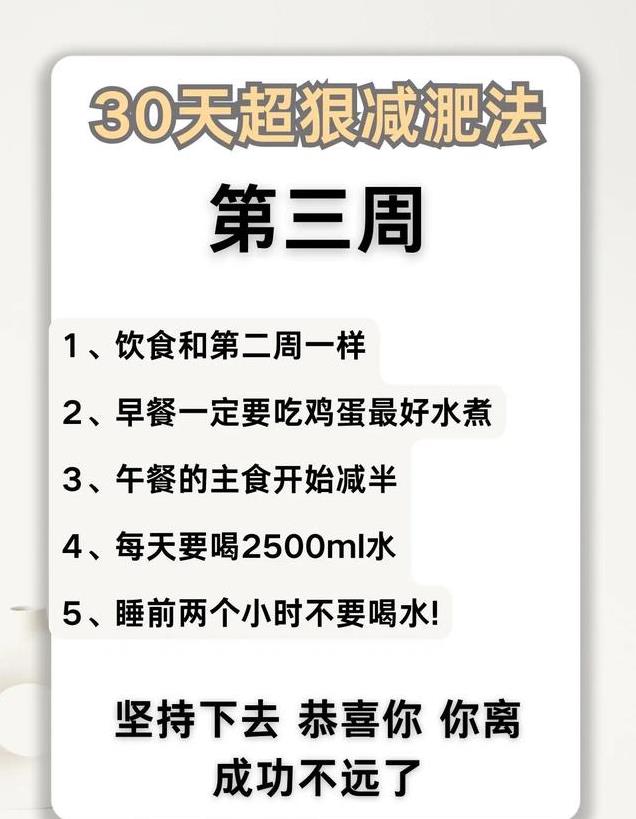 第三周,挑战升级。水的摄入量再次提高,要超过 2500ml,让身体始终处于水润的代谢佳境。开始加入有氧运动,一周三次,每次 30 分钟以上,无论是慢跑、跳绳还是跳健身操,都能让身体的脂肪加速燃烧。这一周只吃早餐和午餐,并且注重蛋白质的补充,为肌肉生长提供原料,肌肉量的增加能进一步提高基础代谢率。饭前喝水,保持饥饿状态入睡,此时距离目标已经越来越近,预计可减重 5 - 7 斤。