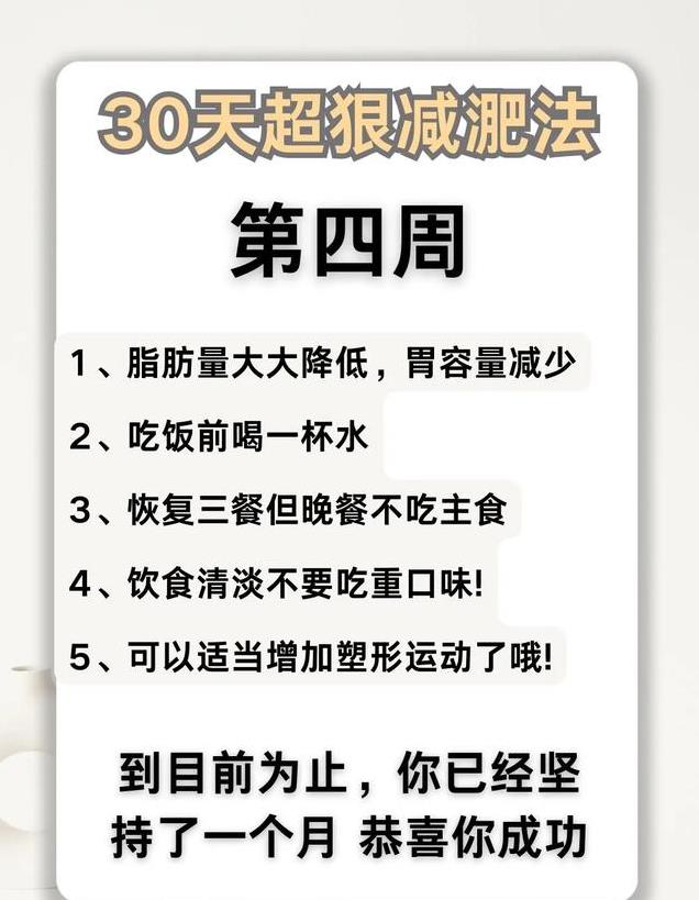 终于来到了第四周,这是冲刺阶段。高水量摄入依旧,每日超 2500ml。运动频率提高到每周五次,让身体持续处于燃脂状态。取消晚餐,让身体更多地消耗储存的脂肪。你会发现,随着脂肪的减少,胃口也变小了。睡前用热水泡脚,促进血液循环和新陈代谢,为一天的减肥画上完美句号。如果能完整地坚持这一个月,你将会收获显著的减肥成效,预计可减重 2 - 6 斤。