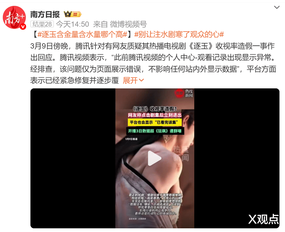 最近,一个令人啼笑皆非的漏洞被网友扒出:在腾讯视频点开《逐玉》,仅仅播放一秒钟,系统竟然直接显示“整集观看完毕”。这不是什么黑科技的极速观影,这是赤裸裸的数据注水。