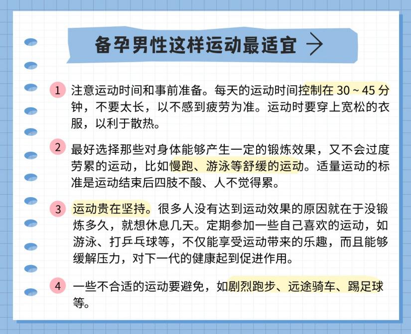 备育男性可以适量运动,但不可剧烈运动。剧烈运动会消耗大量能量,增加人体对氧气的需求量。在缺氧状态下,为人体提供能量的葡萄糖会改变策略,发生无氧酵解,从而产生大量酸性代谢物。一些酸性代谢物通过血液循环进入睾丸,睾丸出于自卫,会产生氧化应激反应,从而增加活性氧成分,如果活性氧的产生超出了精液的抵抗能力,就会损伤精子。精子质量受损会导致受孕概率降低,甚至会导致不育。