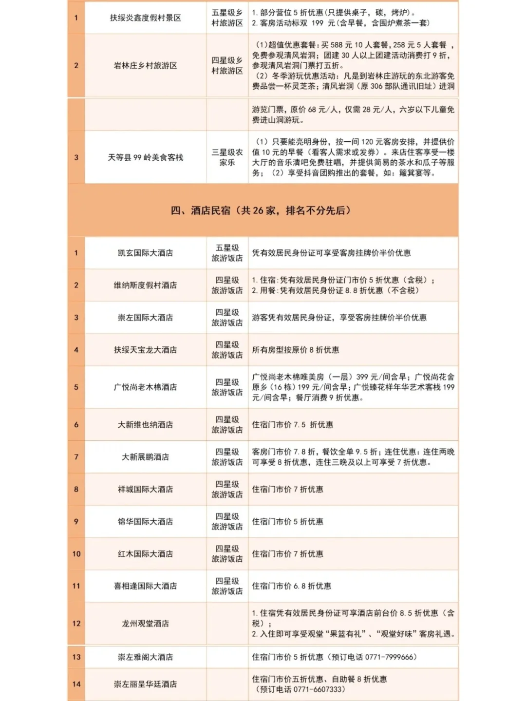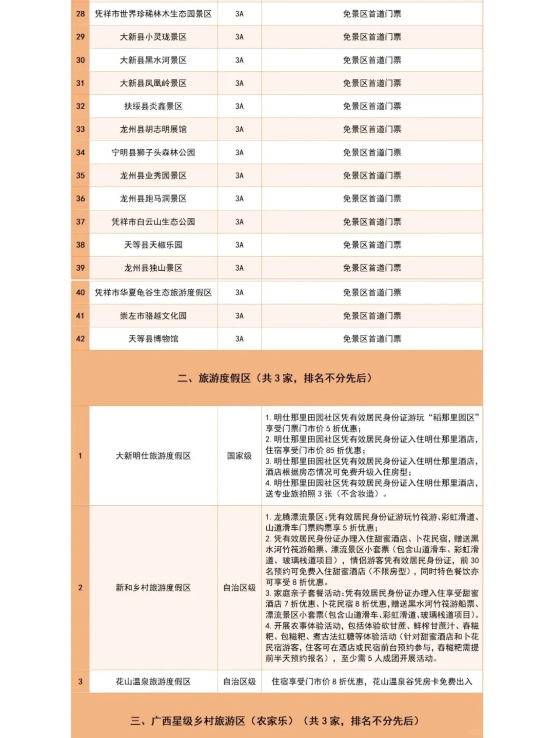 活动时间:2024年11月10日—2025年1月20日 - 活动人群: 对“东北老铁”免费开放,免景区首道门票。享受优惠人群是东北三省及内蒙古东部的呼伦贝尔市、兴安盟、通辽市、赤峰市、锡林郭勒盟。(凭有效居民身份Z享受优惠) - 参与景区:崇左42家A级旅游景区免首道🎫门票,包括5A德天跨国瀑布、4A的友谊关、明仕景区、花山景区、峒那屿湾景区、太平古城…… 而且4A的宁明县花山景区还免游🚣🏻♀船票! 详细目录可查看图片,或详细咨询客服!秋高气爽的广西,包个车出来玩吧!!
