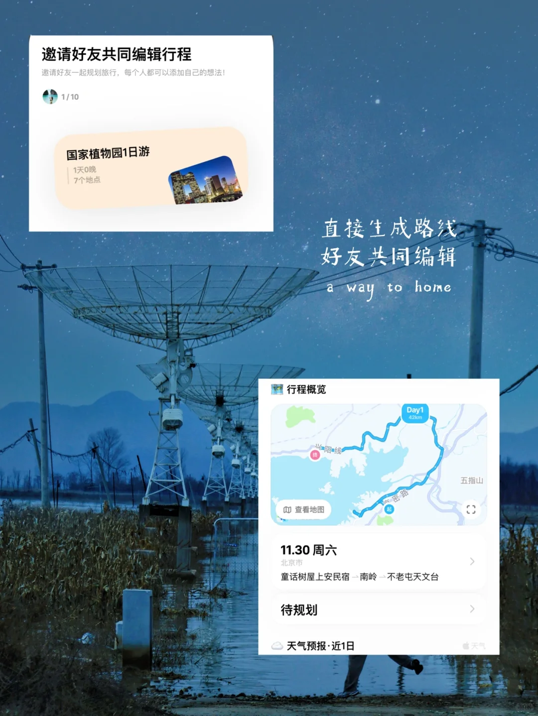 和宇宙约会✨ 不老屯天文台的浪漫🌌 仰望浩瀚的宇宙,我们是如此的渺小🔭💫 这里是《三体》的取景地 跨越六万年和宇宙对话 和宇宙的故事诉说烦恼 感觉自己的烦恼变得无足轻重啦!🛸 密云两日游的攻略,收好哦!📍✈ 第1️⃣站:不老屯天文台🌠 整个区域布满了雷达天线 数百米高的建筑仿佛带我们穿越到三体的世界🌌 漫步其中,你会感受到置身异世界的震撼!✨ 现在,密云水库的水已经漫上来 湖水与废旧天文台的故事感交织在一起🌊🕰。 蓝调时刻 漫天星空,真的太浪漫了!🌙❤ 第2️⃣站:童话树屋📚🌈 在天文台观完星空后,去旁边的童话树屋上安 一顿火锅大餐太满足了🍲🔥 泡着热汤,看着密云水库 私汤是24h恒温的 准备了长款羽绒服和泡汤浴袍,不会觉得冷了 还有冬季限定的篝火🔥🎉 烤棉花糖、烤玉米、烤马铃薯、煮红酒 感受乡村生活的温暖与惬意 第3️⃣站:南岭村📍🏞 这里可以到水库边 树长在水里 如同小洱海般的美景 🗺 路线:详细路线和攻略放在我的圆周旅迹里,可以找我要哦!地图有周边顺路景点美食,也可以复制文章或识图一键生成攻略,制定个性路线不走冤枉路,好友共同编辑,让出行更省心,!✈🌍 快来和宇宙约会吧!🪐💕