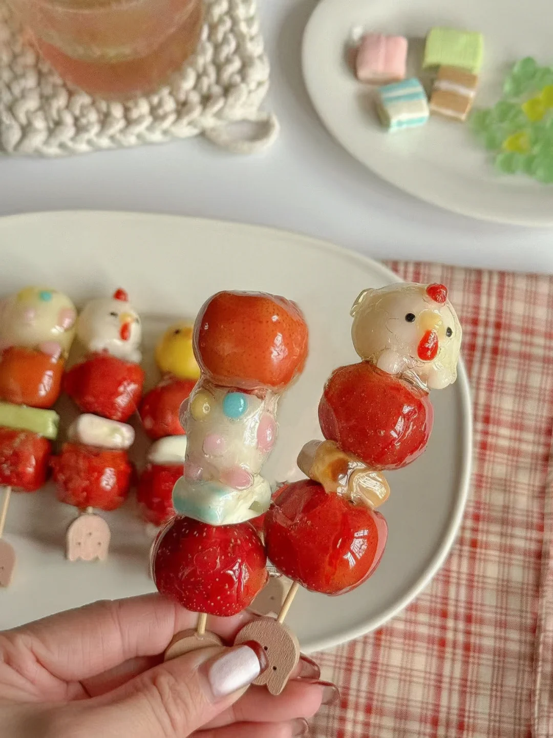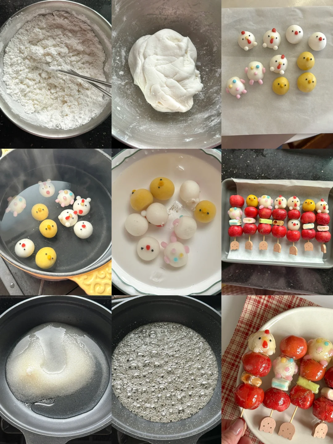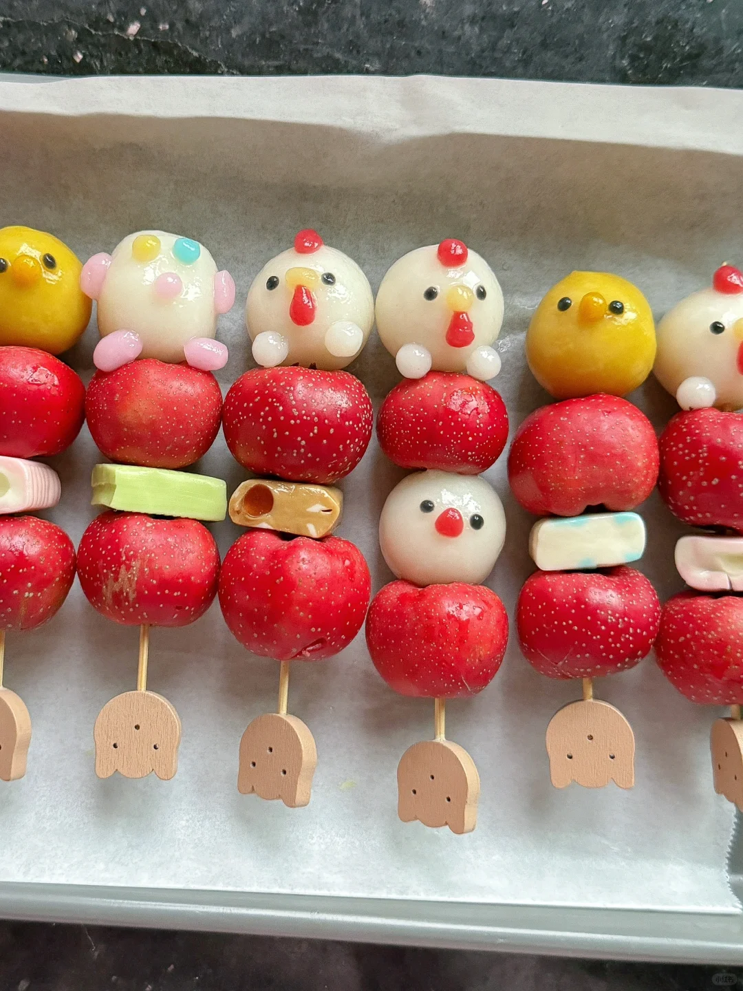 2️⃣将制作好的年糕煮熟后过冰水,洗净的山楂擦干水分,将年糕、山楂和软糖串起来