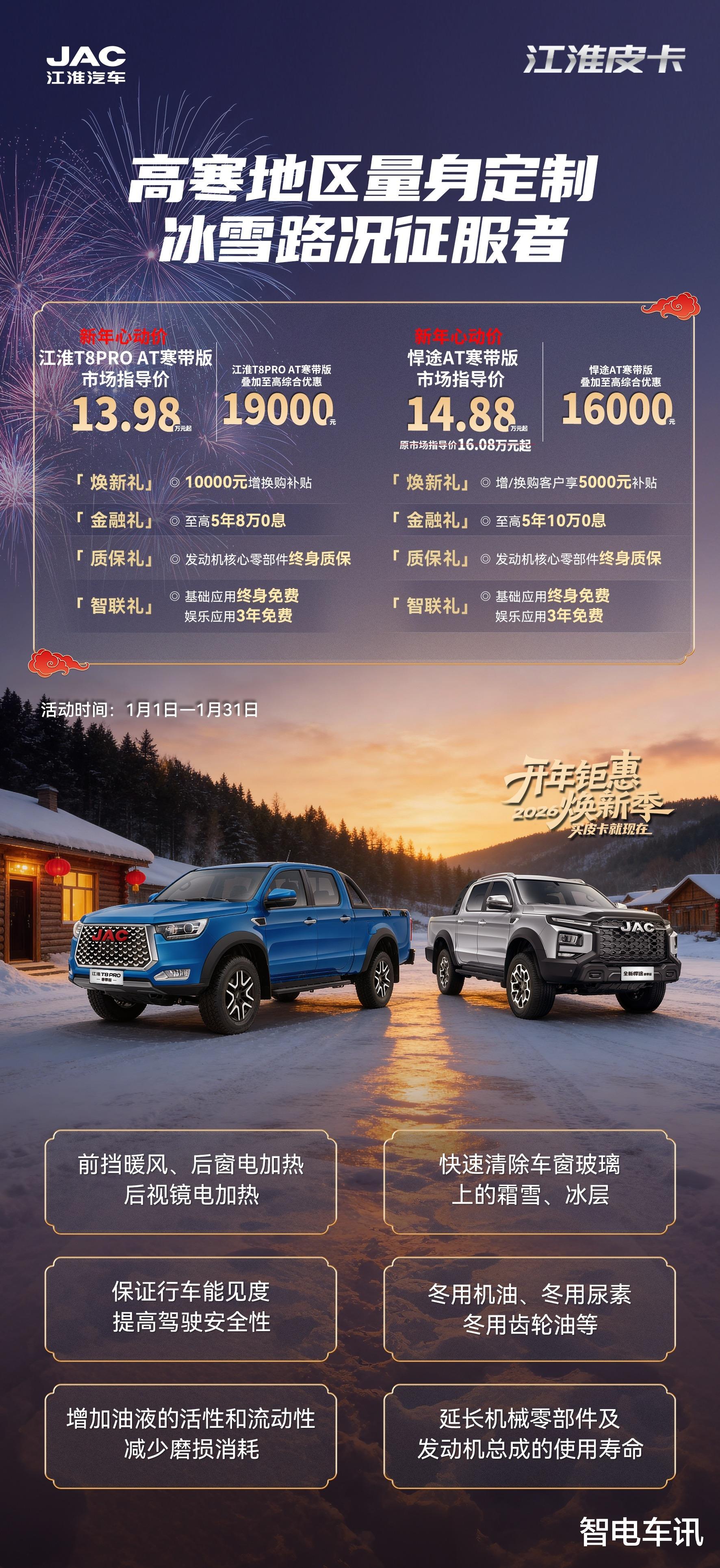 针对北方高寒地区用户,江淮皮卡推出江淮T8 PRO AT与江淮悍途AT两款“寒带版”车型,一系列专属配置有效解决了冬季启动难、视野差、磨损大等痛点。其中,江淮T8 PRO AT寒带版心动价13.98万元,再享至高19000元综合优惠;江淮悍途AT寒带版心动价14.88万元,再享至高16000元综合优惠。