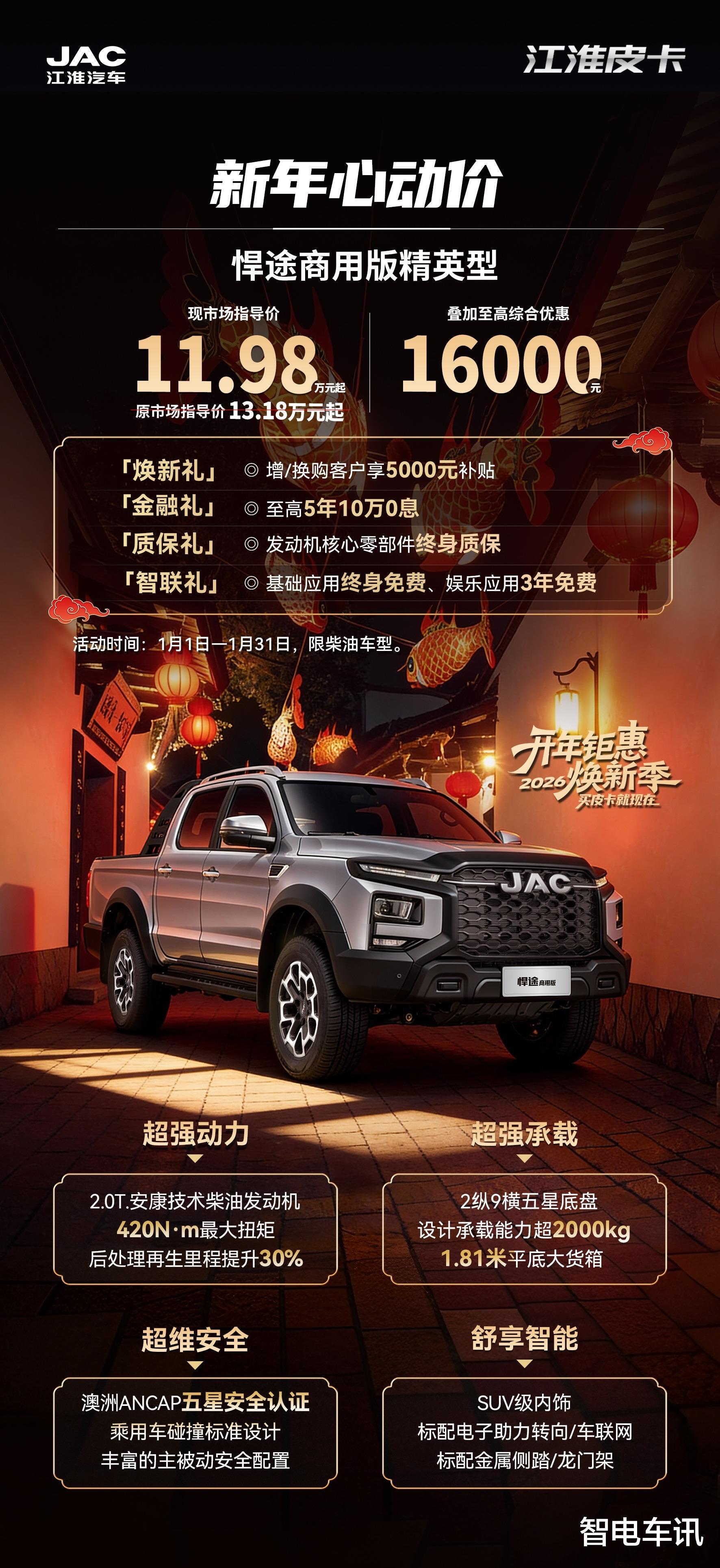 买皮卡,就现在!新年伊始,江淮皮卡“2026焕新季”火热来袭,爆款车型诚意满满,燃油、混动、纯电多重动力选择。具体情况如何,咱们细细道来!
