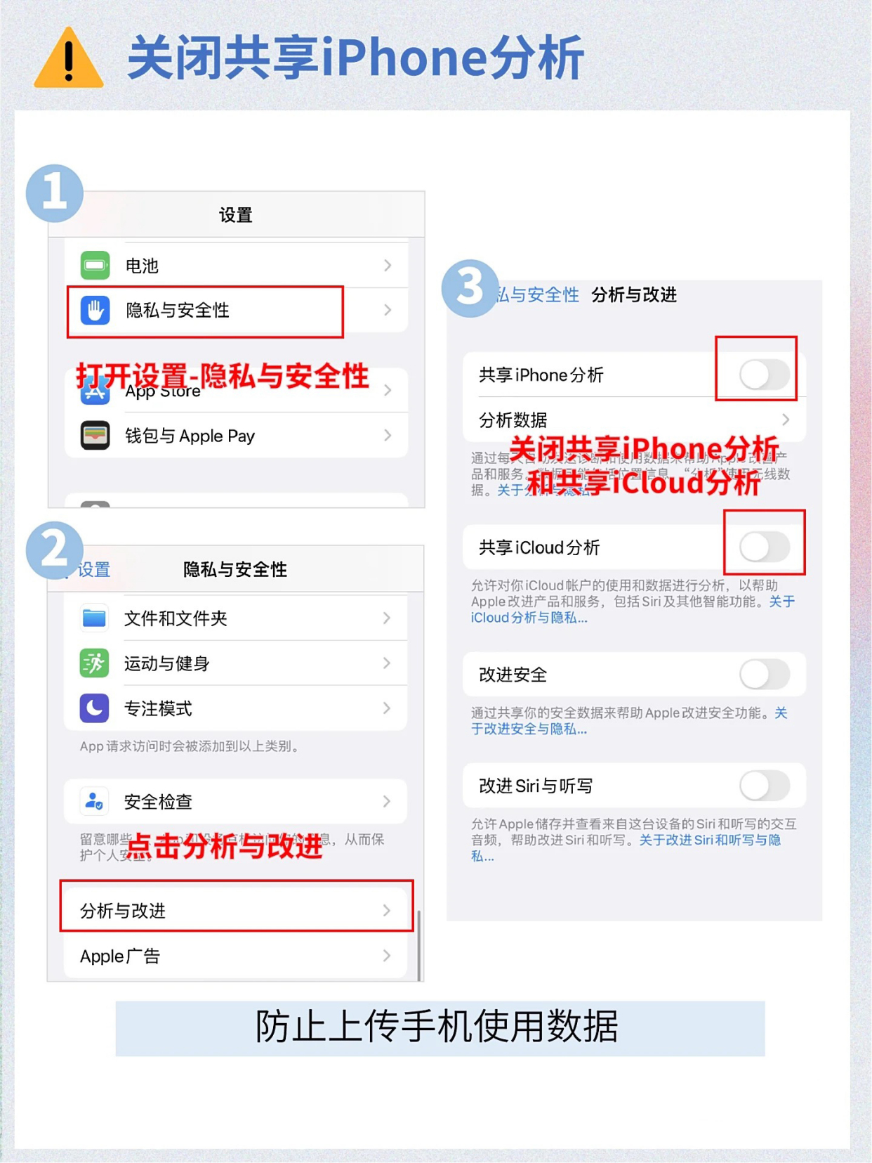 打开【设置】点击【隐私与安全性】进入【分析与改进】关闭【共享iPhone分析】和【共享iCloud分析】