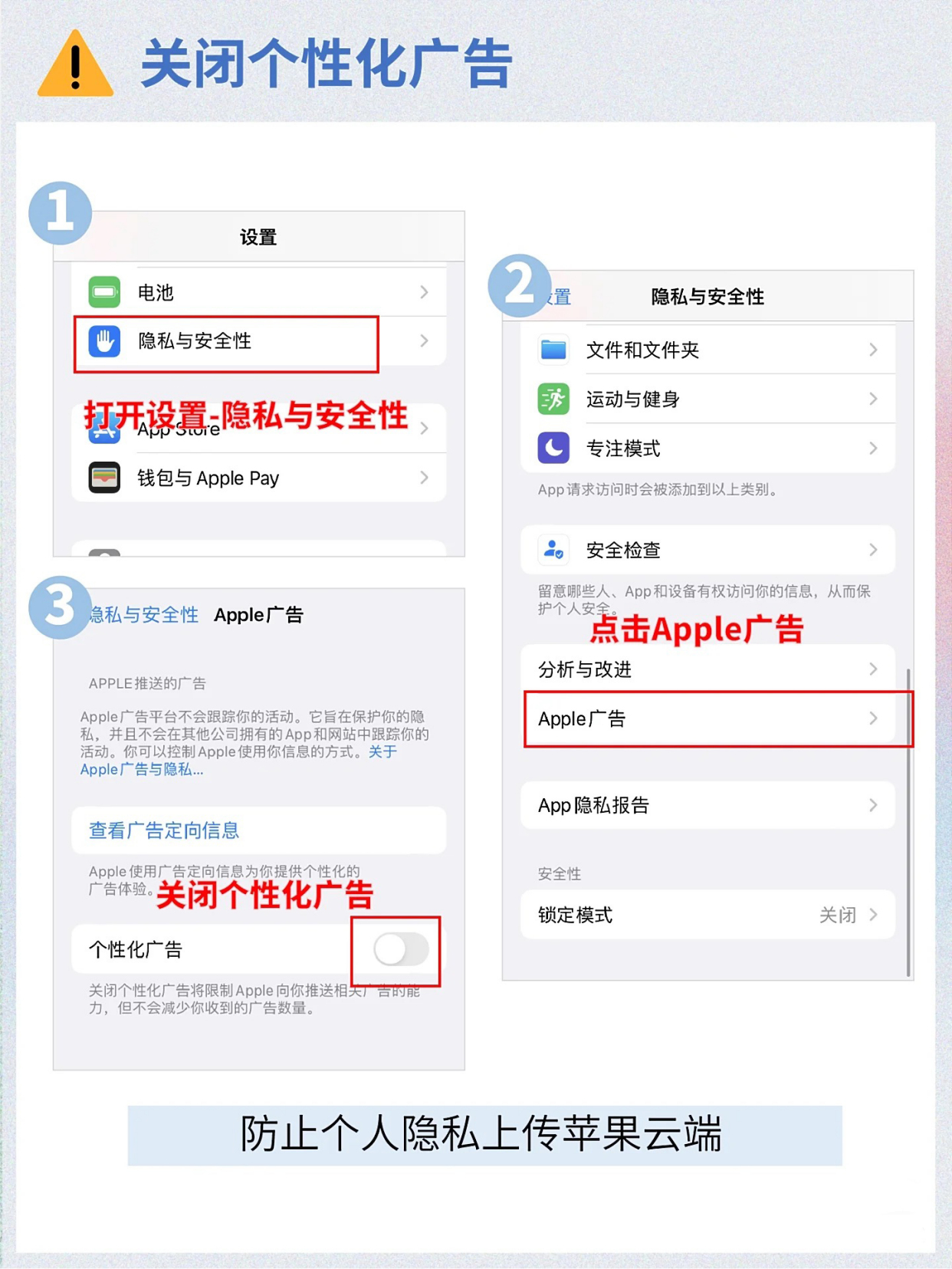 打开【设置】点击【隐私与安全性】进入【Apple广告】关闭【个性化广告】