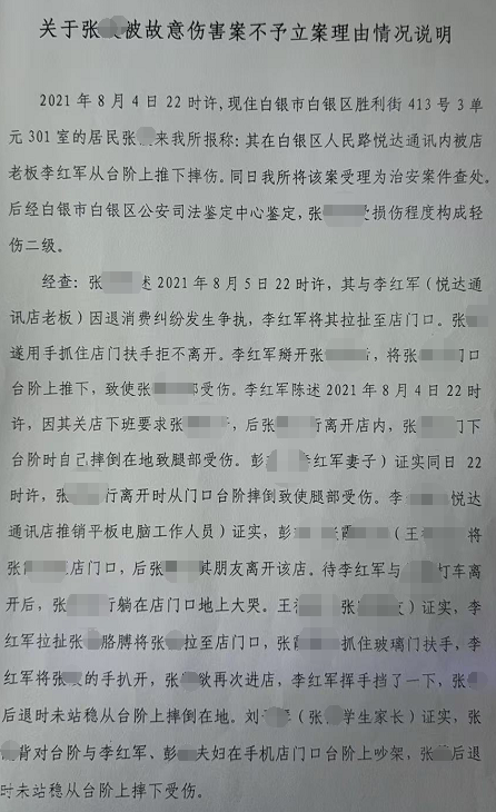 本以为事情就此告一段落,可张某霞却蛮不讲理,依旧胡搅蛮缠的向人民路派出所、区GA分局、市GA局进行无休止的报案以及信访,白银区人民JC院因为张某霞不断的上访乱告,也是谨慎对待此案,认真细致侦察,因为当时案发地没有监控,J方这边经过长达六个多月的走访调查以及取证,最终做出了张某霞受伤与李红军夫妇无法律上的因果关系,张某霞是自身没站稳从台阶上摔下致伤的结论。
